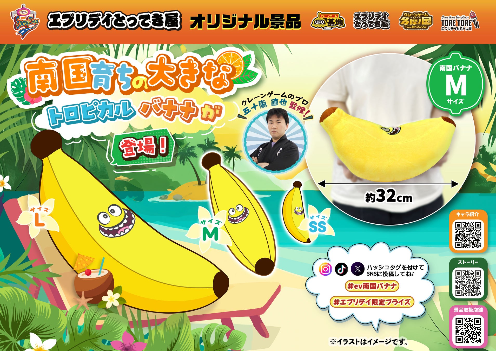 今回新たに登場するのは南国気分たっぷりのビジュアルが目を引く、「南国育ちの大きな トロピカルバナナ」がエブリデイオリジナル景品として登場!思わず抱きしめたくなる、ふんわりやわらかな手触りと、にっこり笑顔のトレが魅力のバナナ型ぬいぐるみです。南国リゾートをイメージしたポップで明るいデザインは、見た目のインパクトも抜群。サイズはS・M・Lの3種類をご用意。 手のひらサイズでかわいいSサイズ(約14cm)から、抱えて楽しめる存在感抜群のLサイズ(約60cm)まで、用途や好みに合わせて選べます。