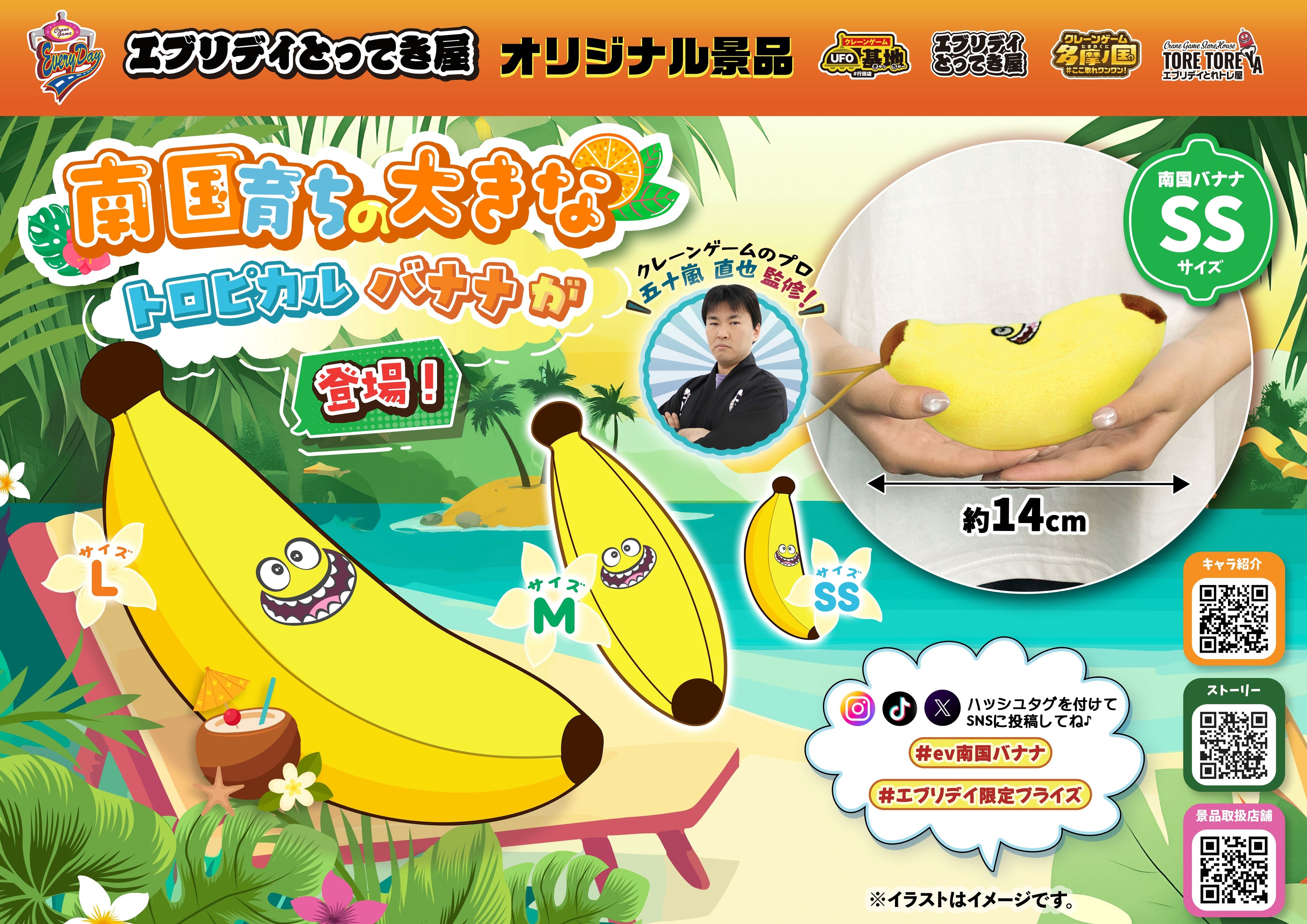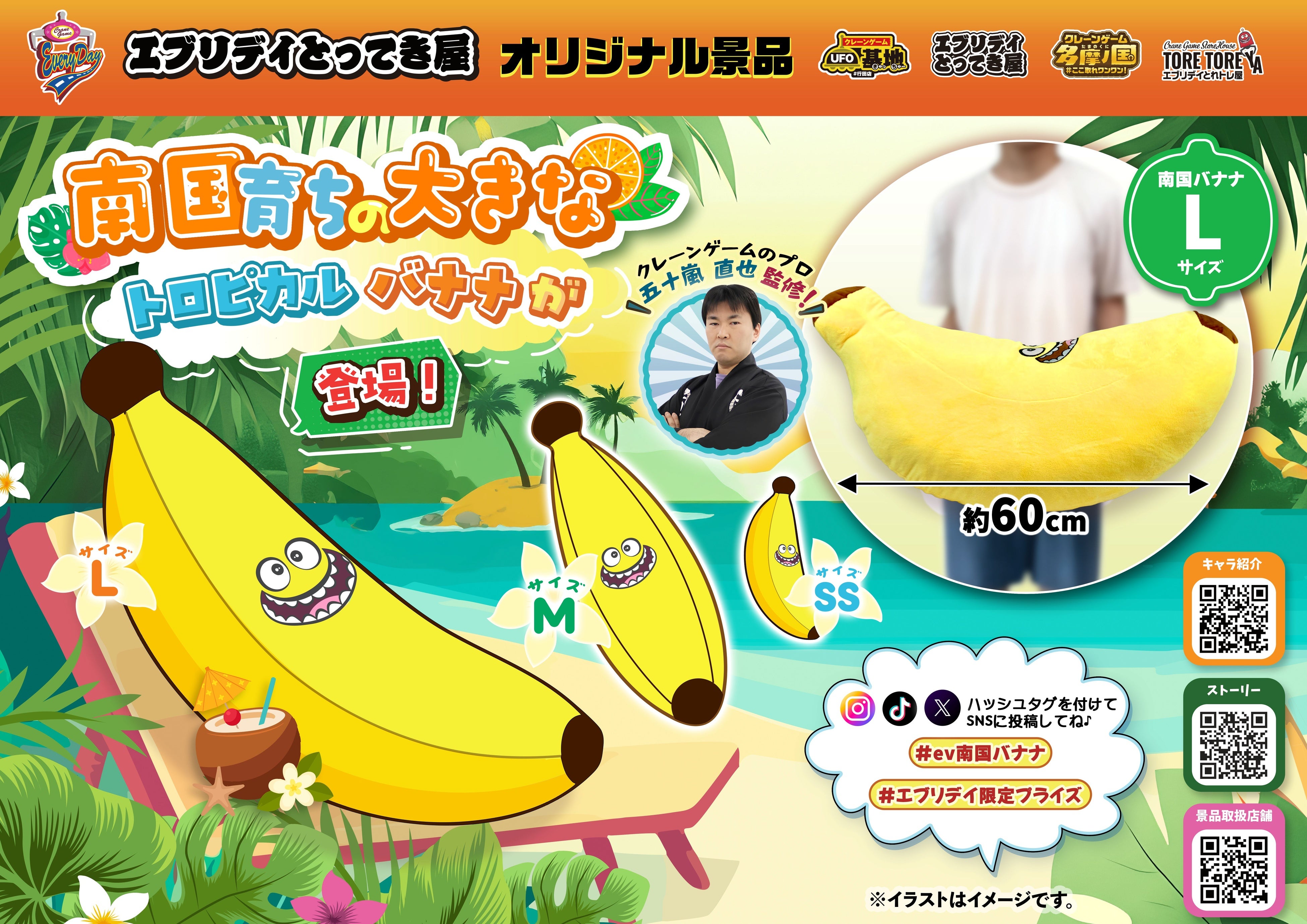 今回新たに登場するのは南国気分たっぷりのビジュアルが目を引く、「南国育ちの大きな トロピカルバナナ」がエブリデイオリジナル景品として登場!思わず抱きしめたくなる、ふんわりやわらかな手触りと、にっこり笑顔のトレが魅力のバナナ型ぬいぐるみです。南国リゾートをイメージしたポップで明るいデザインは、見た目のインパクトも抜群。サイズはS・M・Lの3種類をご用意。 手のひらサイズでかわいいSサイズ(約14cm)から、抱えて楽しめる存在感抜群のLサイズ(約60cm)まで、用途や好みに合わせて選べます。