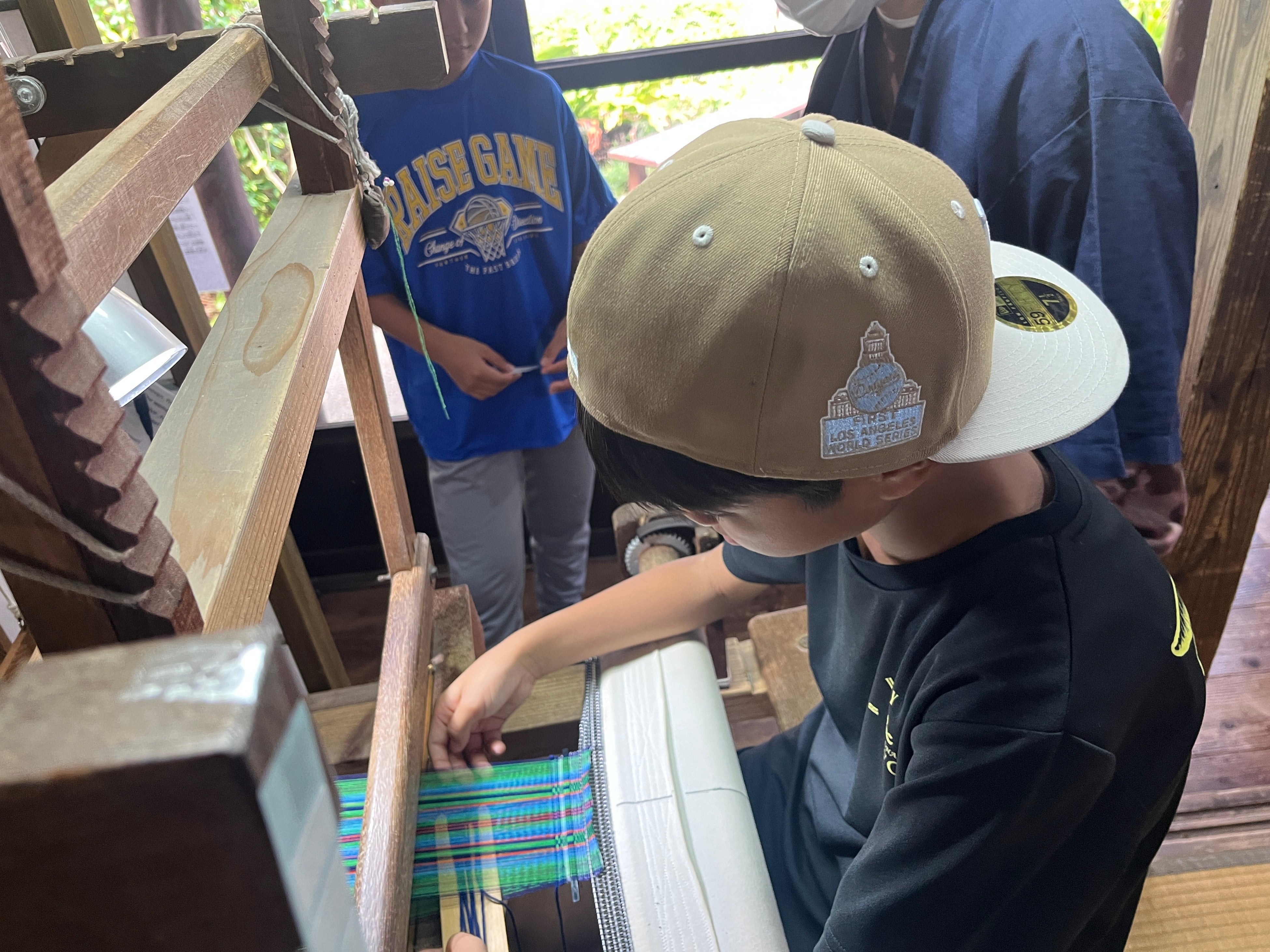 沖縄県南城市にある観光施設おきなわワールド(南都グループ)内にある「琉球王国城下町」にて、2025年11月27日(木)、今帰仁村立今帰仁小学校6年生46名が、修学旅行の一環として「機織り」と「ブクブクー茶」の体験に挑戦しました。
