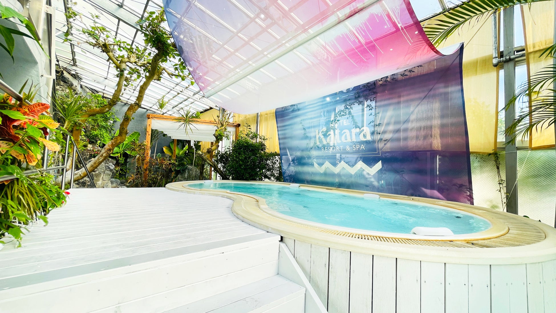 全天候型温泉プールで一年中楽しめる。