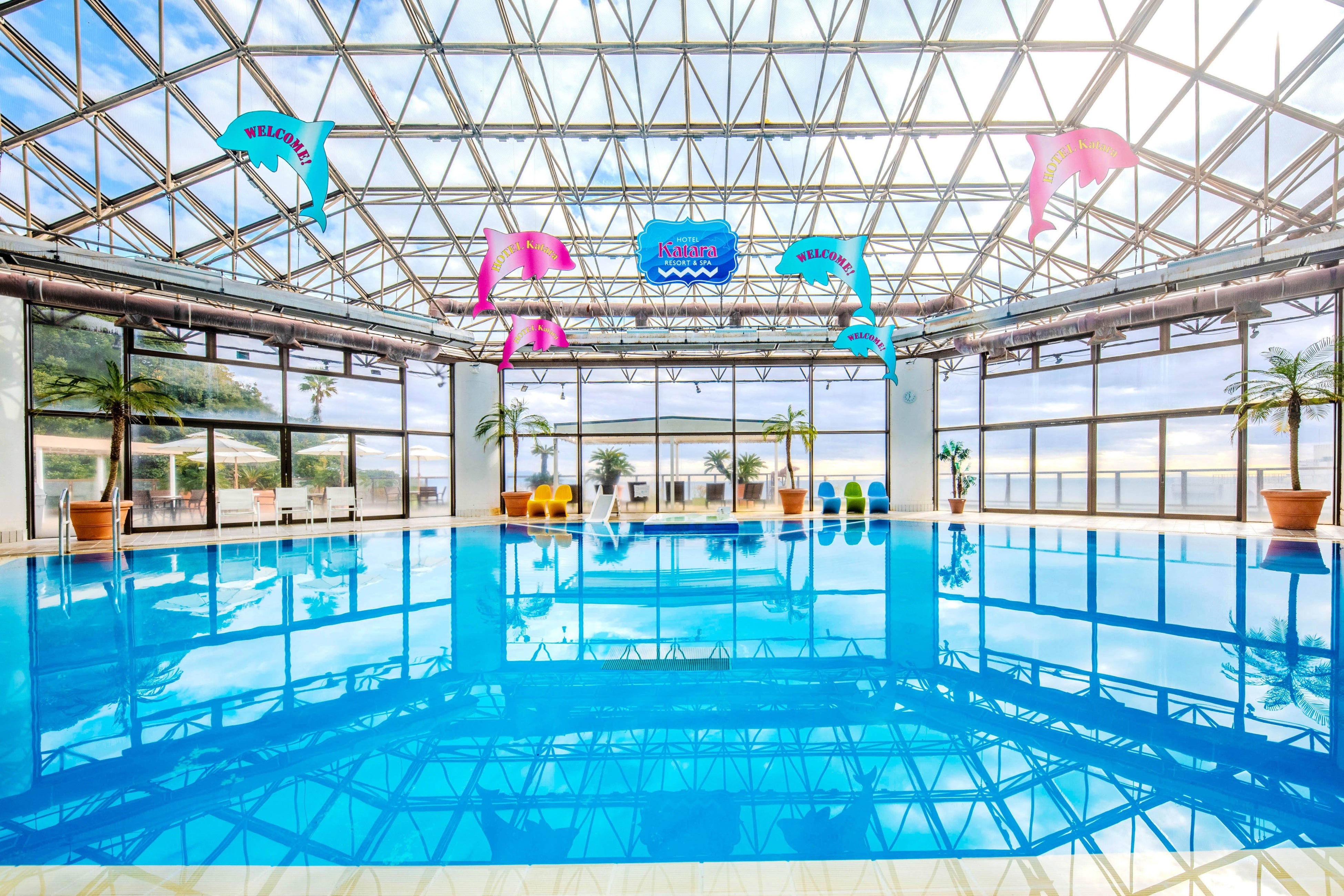 全天候型温泉プールで一年中楽しめる。