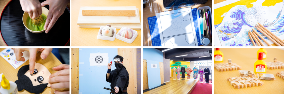 茶道体験、和菓子作り体験、漫画体験、浮世絵塗り絵体験、組木コースター体験、推しぬい体験、忍者体験、浴衣着付体験など、日本の伝統文化からポップカルチャーまで幅広いプログラムを展開します。各プログラムはインストラクターが丁寧にサポートし、初心者や訪日外国人の方でも安心して参加できる内容となっています。