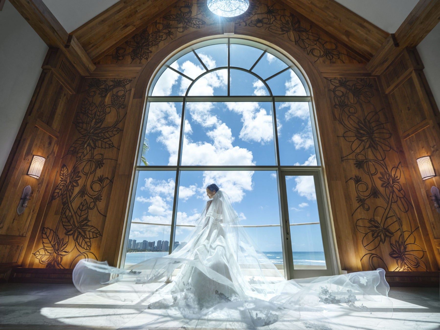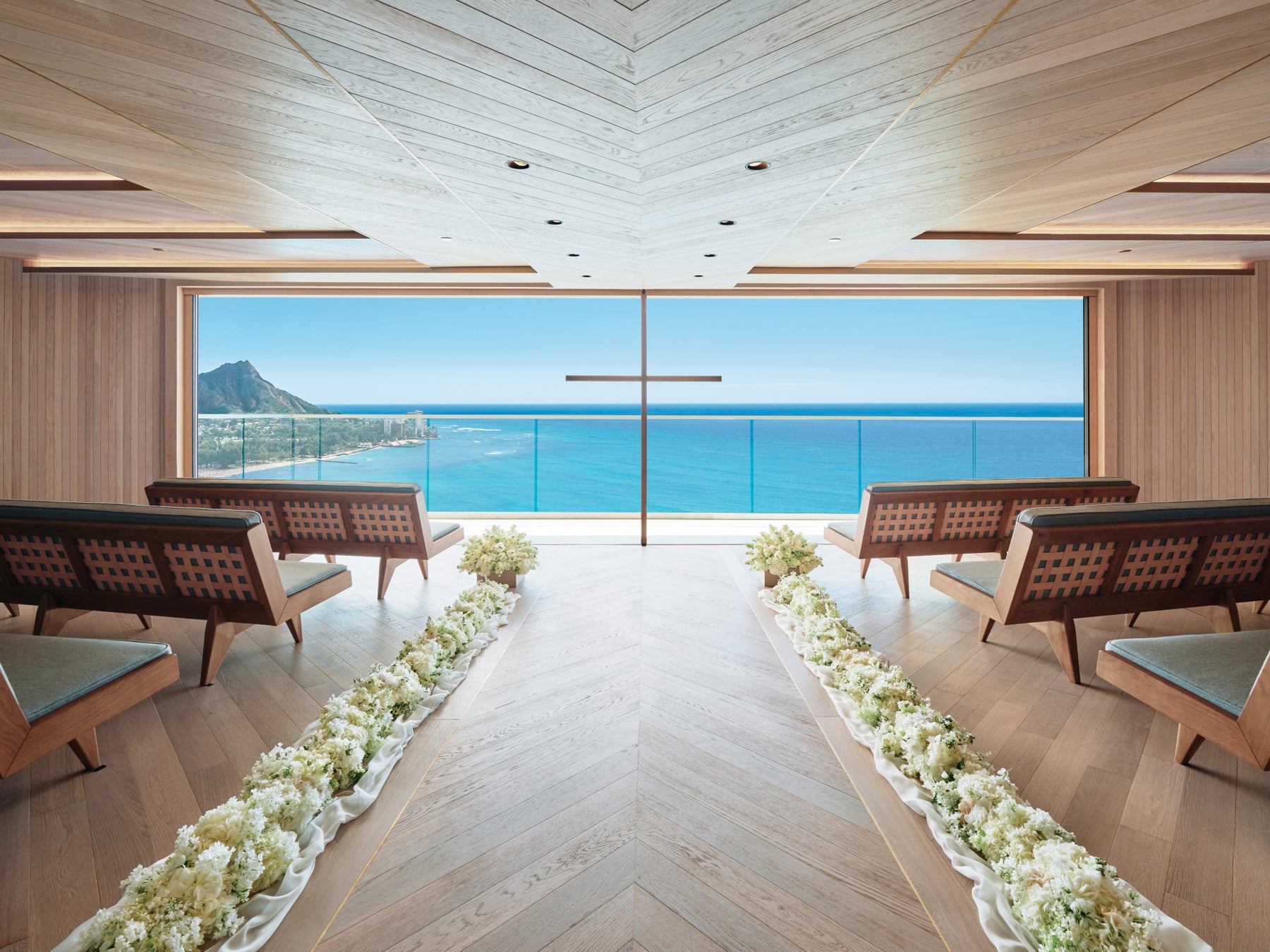同施設内には2つのチャペル、ハワイで崇められてきた聖なる木“コアウッド”に小花“ナウパカ”の彫刻を施した、木目の美しさと温もりが溢れる「カウイチャペル」と、幸運をもたらすといわれる珊瑚でできた“コーラルストーン”で造られた「ナウパカチャペル」があり、特別な日を華やかに彩ります。ほかにも大理石の大階段や、花々に囲まれたセレブレーションガーデンを備え、様々なウエディングシーンを演出。