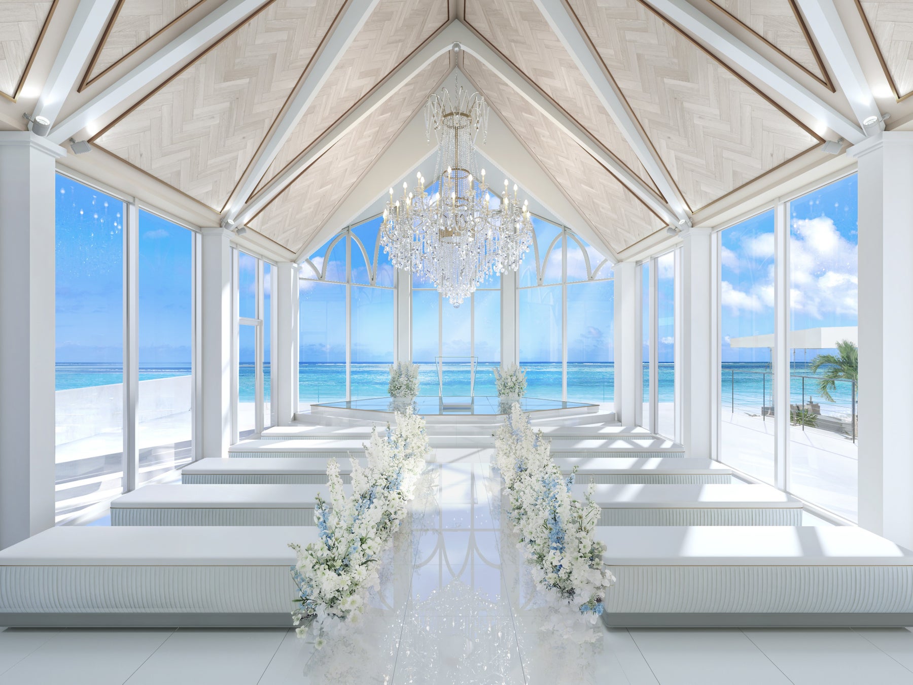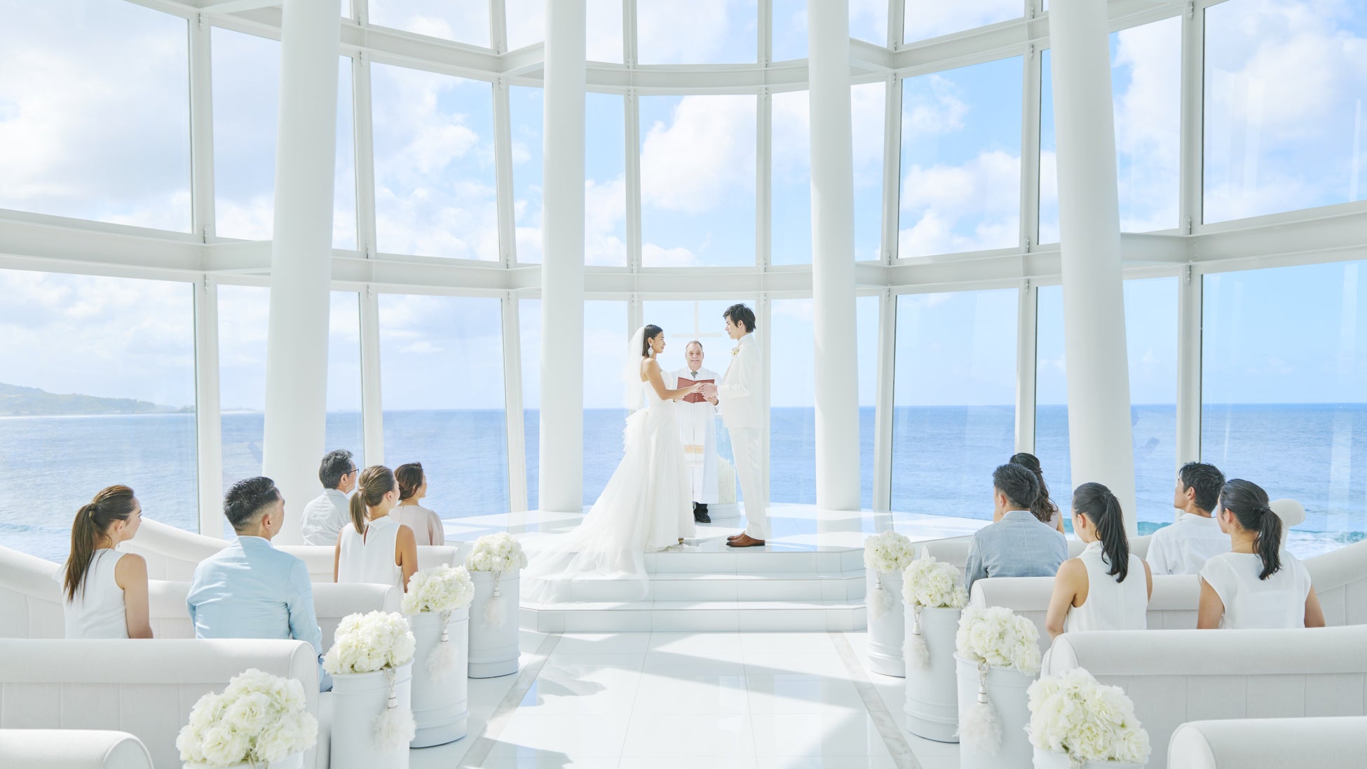 グアムの美しい海岸線に面した立地を生かし、海にせり出すように建てられた絶景を見晴らすチャペル。270度を海に囲まれたロケーションで、挙式のどの瞬間においても、雄大なオーシャンビューが広がるセレモニーを実現します。