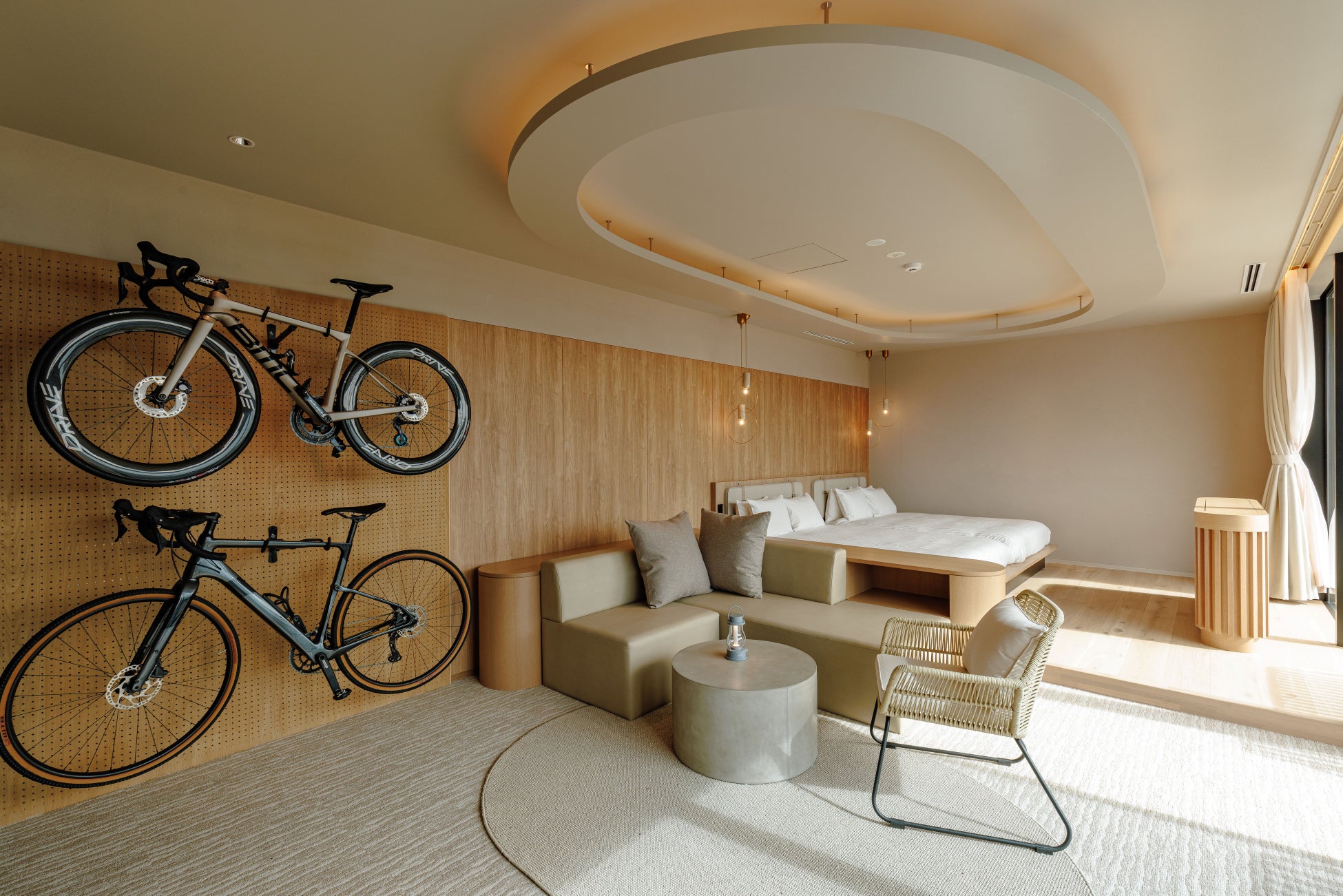 「CARAVAN」をコンセプトに、次の冒険へ心が躍る滞在を演出。7タイプあるお部屋すべての客室内に自転車の持ち込みができ、必要なものへすぐ手が届くコンパクトで機能的なレイアウトに、遊び心ある要素を加え、サイクリストから旅行者まで、多様な旅のスタイルに寄り添う客室となっている。全123室のうち69室が競輪バンク側(velodrome side/ヴェロドロームサイド)に面しており、部屋から競輪場を眺めることができます。