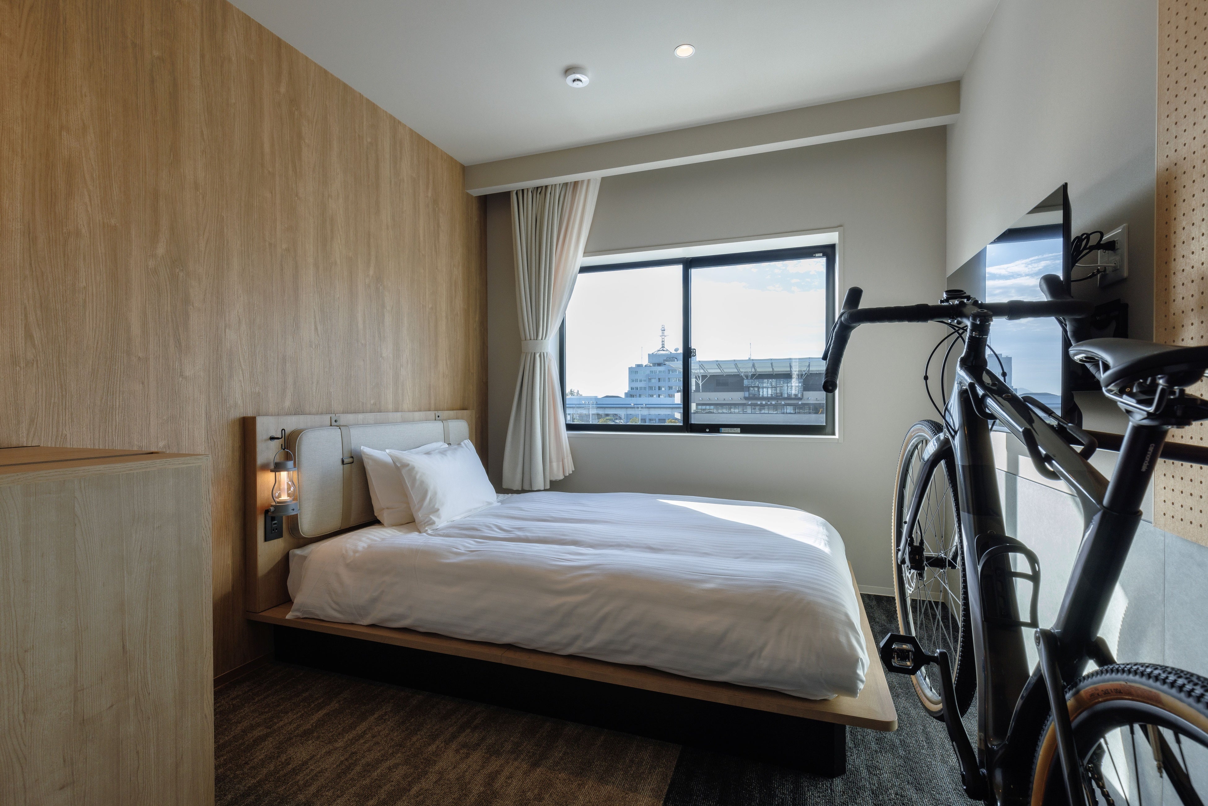 「CARAVAN」をコンセプトに、次の冒険へ心が躍る滞在を演出。7タイプあるお部屋すべての客室内に自転車の持ち込みができ、必要なものへすぐ手が届くコンパクトで機能的なレイアウトに、遊び心ある要素を加え、サイクリストから旅行者まで、多様な旅のスタイルに寄り添う客室となっている。全123室のうち69室が競輪バンク側(velodrome side/ヴェロドロームサイド)に面しており、部屋から競輪場を眺めることができます。