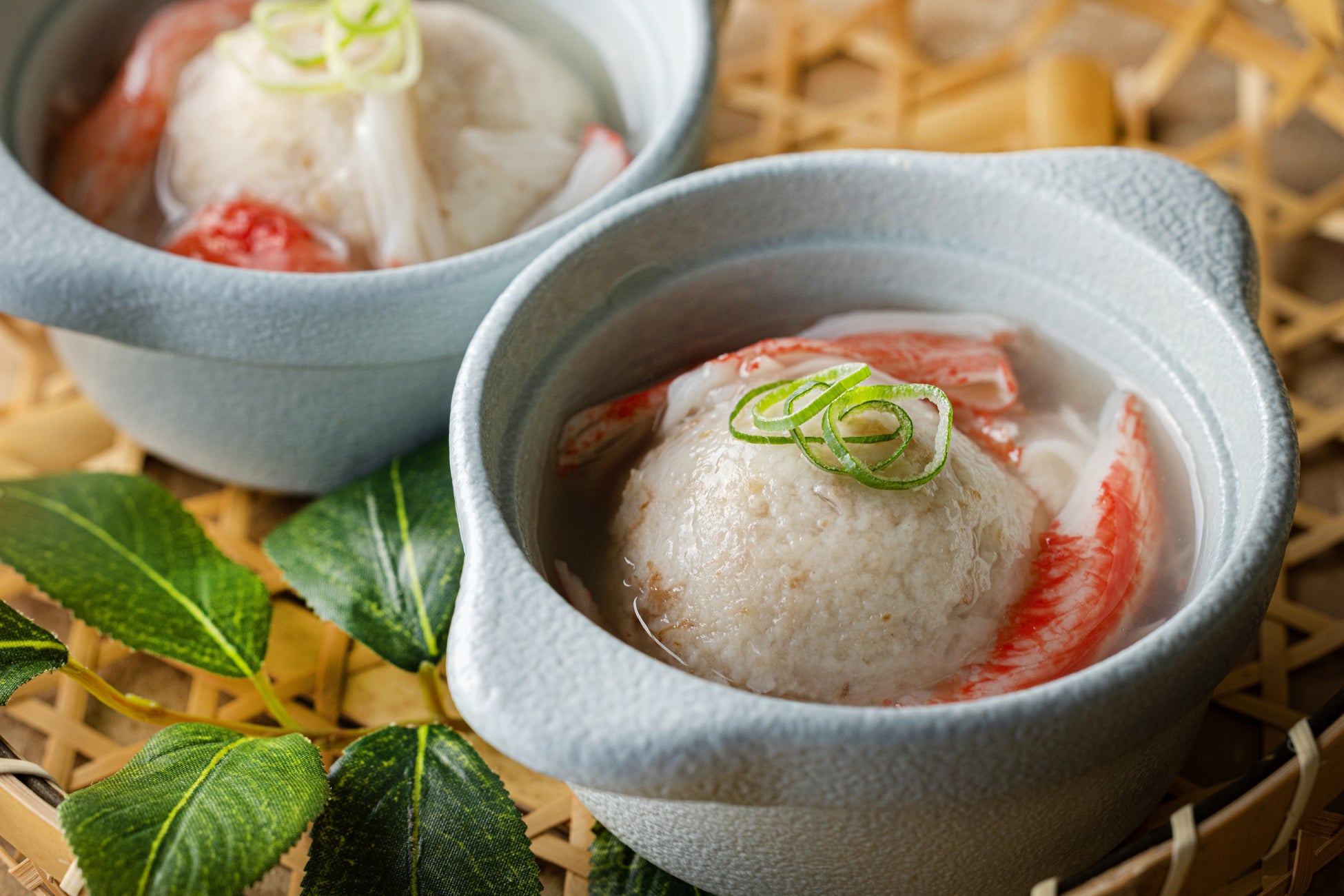 まるで本物の蟹のような食感のカニカマ「スギヨの香り箱」を使用した優しい味わいの餡とともにお召しあがりいただきます。※ディナーのみ提供
