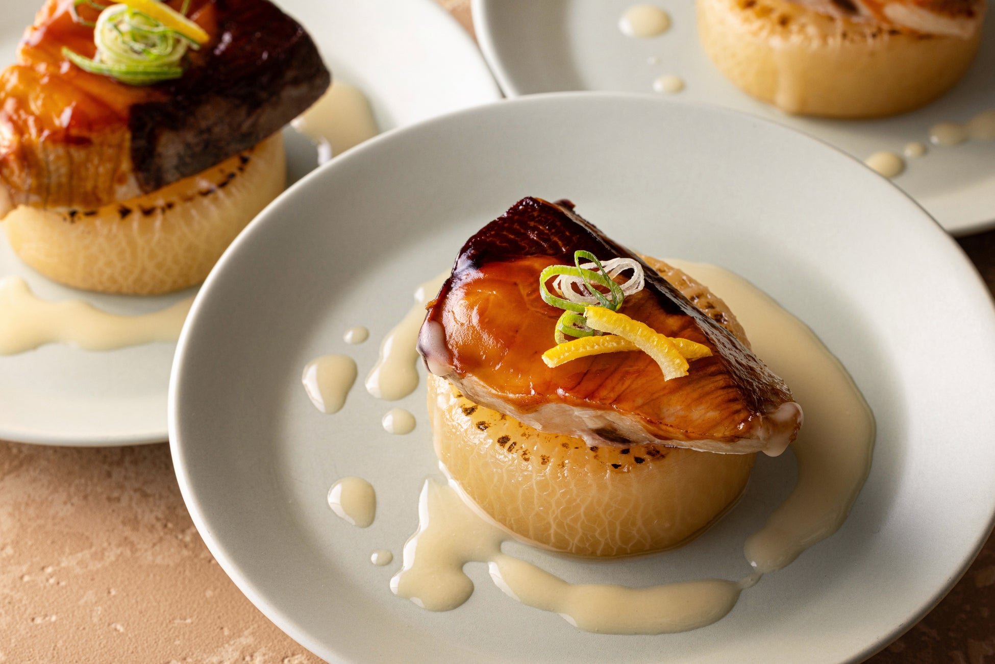 大根をコンソメでじっくり煮込み、照りを出したぶりをのせご提供いたします。やわらかくコンソメの味のしみた大根に、ぶり特有の香りと脂が合わさり、特製のソースが味をまとめる、まさに洋と和のマリアージュです。※ランチ、ディナー提供