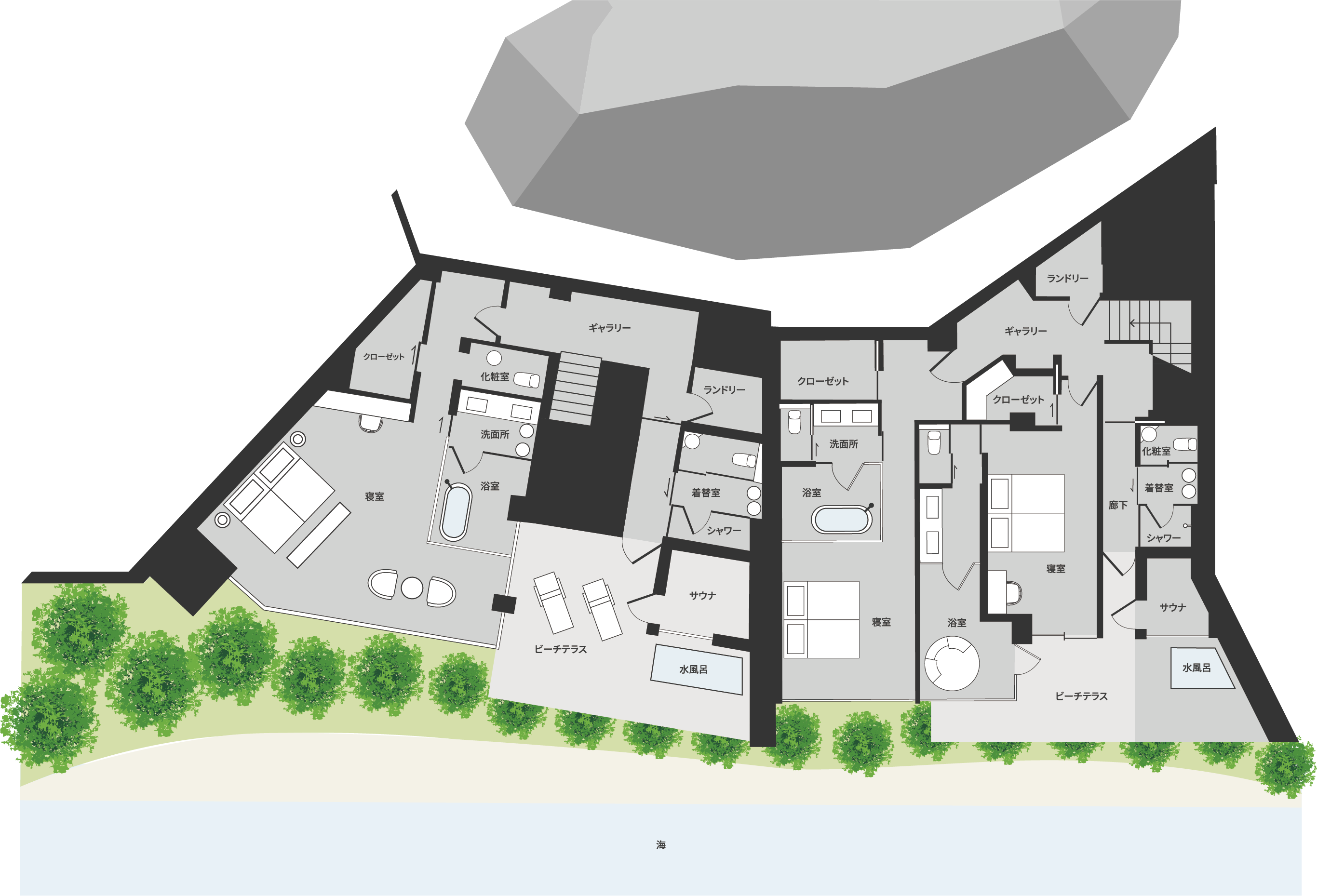 ビーチ棟:崖から海へ、劇的な到着体験
