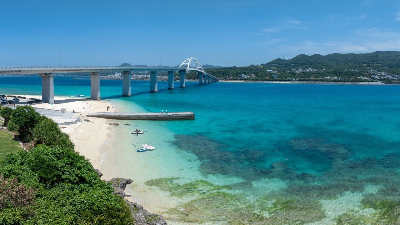 崖を切り開き、海岸線へと導かれるアプローチの先には、緑の植生と岩肌、そして視界いっぱいに広がるパノラマのオーシャンビューが現れ、沖縄本島へと続く橋の景観が重なります。