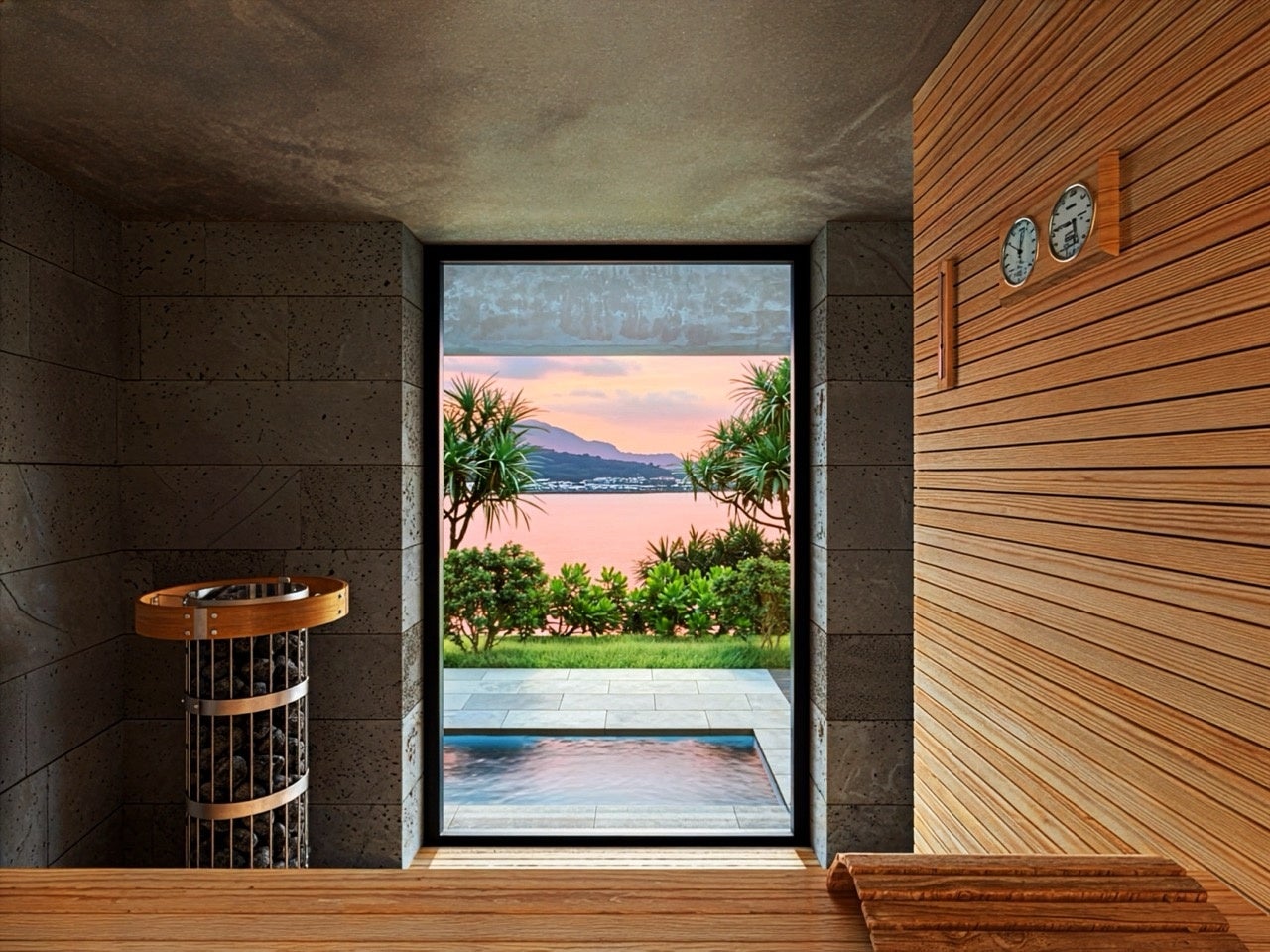 また、窓の向こうに海景が広がるサウナでは、自然と一体になる深いリラクゼーションへと導かれます。