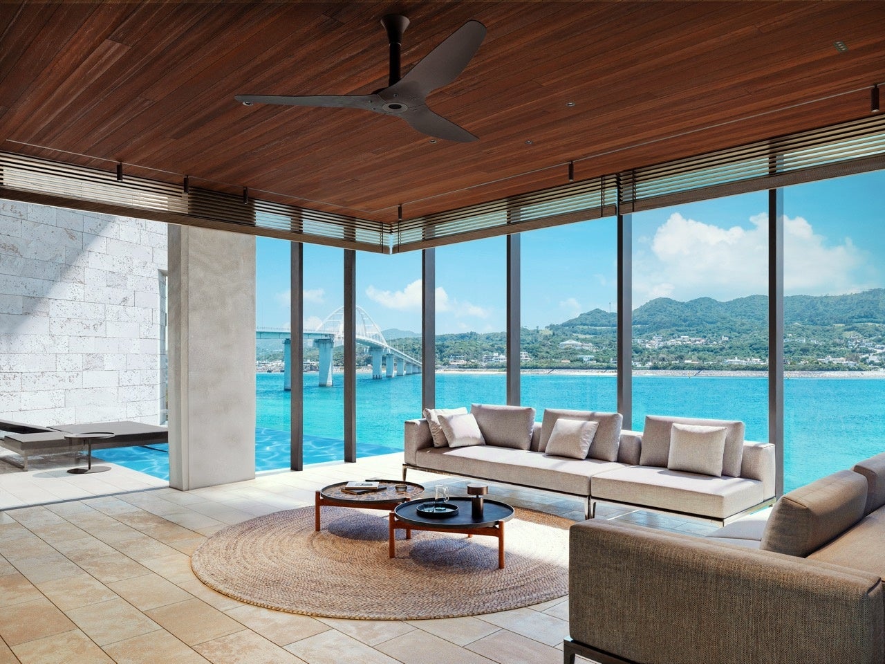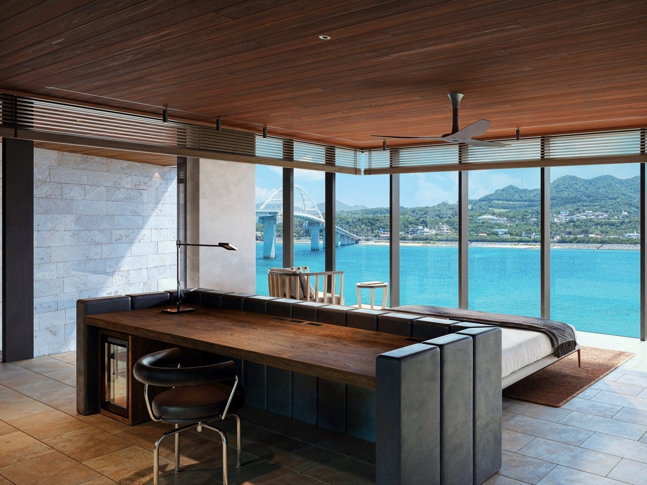 吹き抜けと大開口が生む圧倒的な開放感と、プールの水面に揺れる光の反射が、滞在をドラマティックに演出。「橋」と「GROTTO」の迫力を同時に味わえる特等席です。