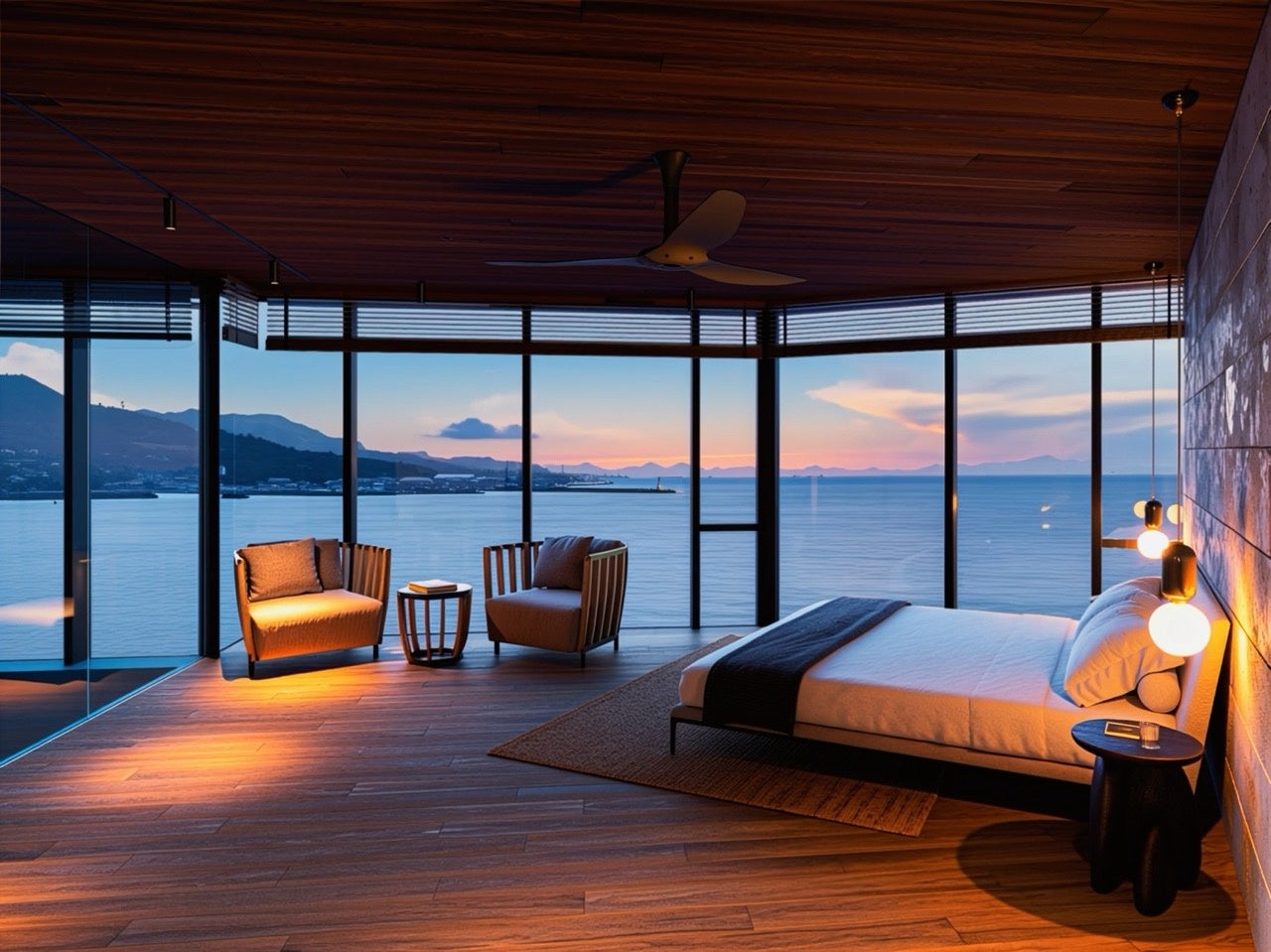 昼は空と海の開放感、夜には対岸の街の灯りが浮かび上がり、時間とともに表情を変える景色が滞在に静かなリズムをもたらします。