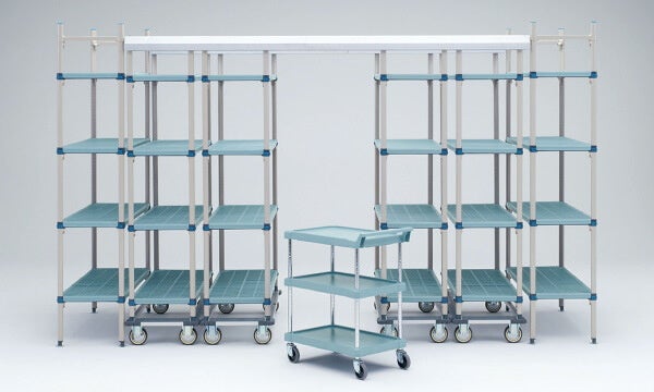 基礎工事が不要で、ユニットの拡張やレイアウトの変更も簡単。レールが床面ではなくシェルフの上部にあるため、カートによるピッキング作業も容易に行うことができ、作業の効率化が図れます。