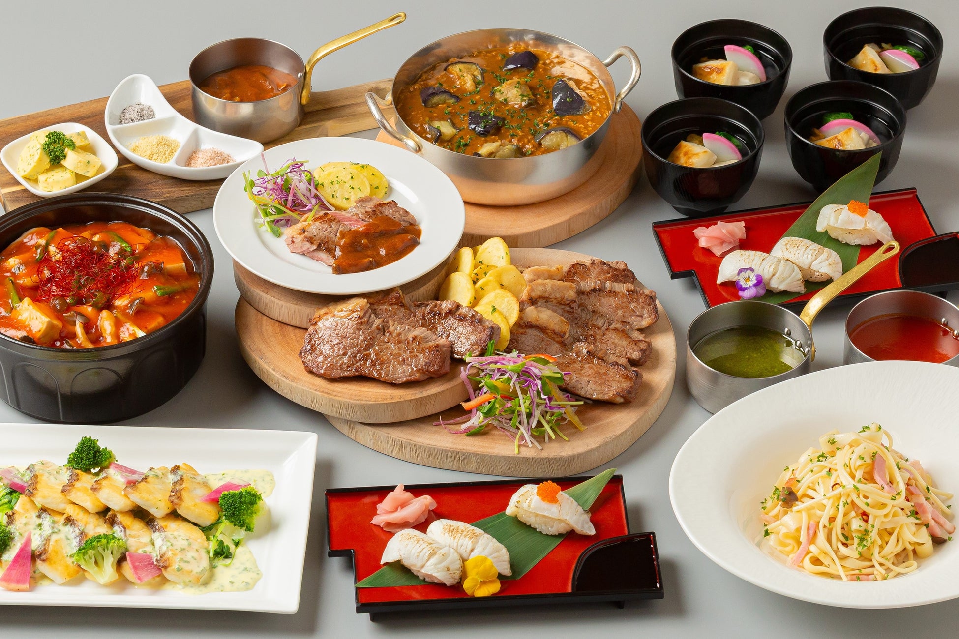 リニューアルを記念して、同レストランで開催しているフェアでは、週末・祝日限定でグレードアップした料理をご提供〈2月11日(水・祝日)および2月14日(土)のランチタイムは除く〉。ランチタイムの『洋食屋さんのランチブッフェ』では、通常ラインアップの「煮込みハンバーグ」「ふわとろオムライス」「カリフラワーと九州大麦グラノーラのシーザーサラダ」に加え、「5種類のお寿司」をご提供いたします。