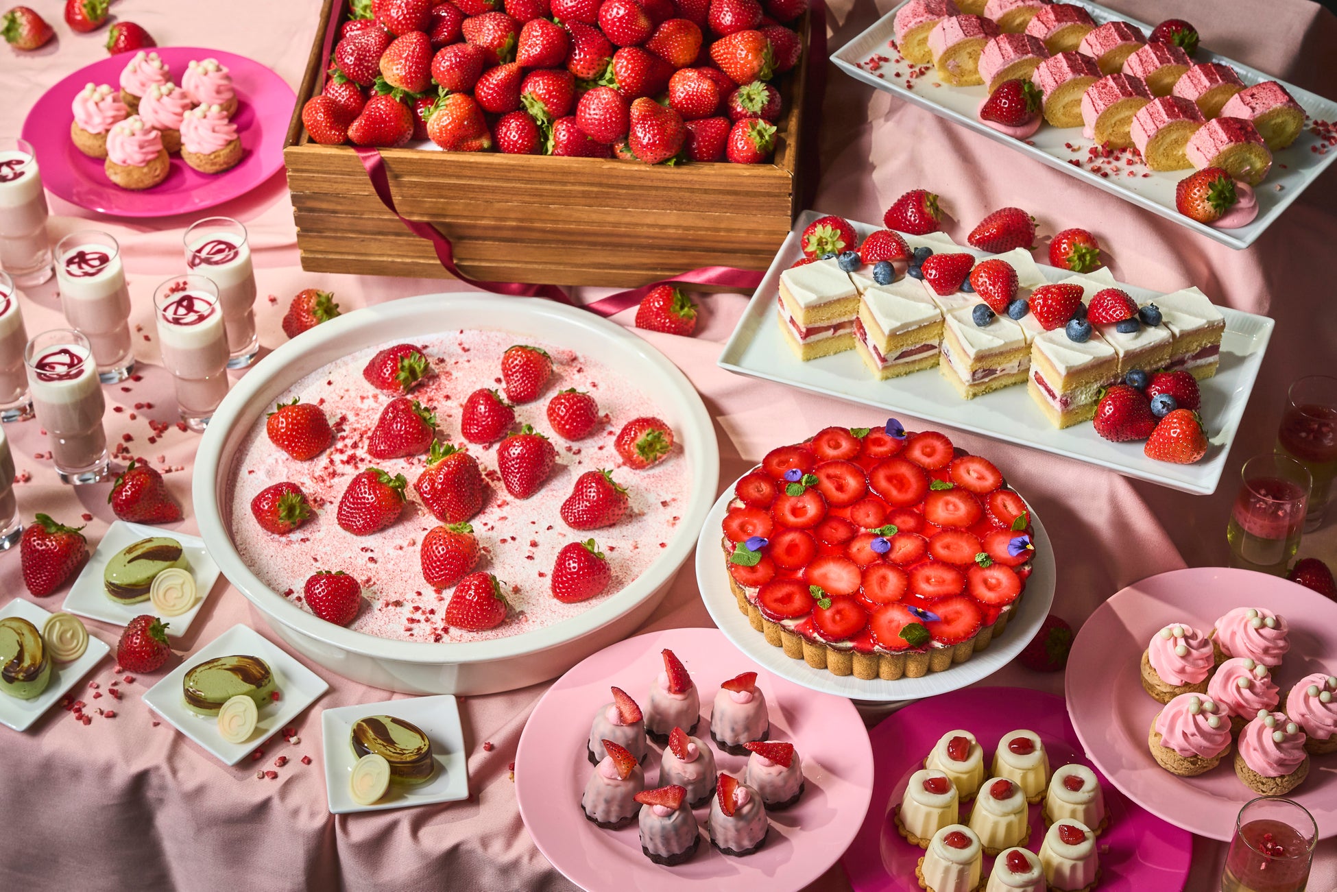 「スイーツビュッフェ」では、エグゼクティブペストリーシェフ 伊藤 慎二が率いるペストリーチームが腕をふるい、旬の苺をふんだんに使用した華やかなスイーツを約25種ご用意いたします。中でも注目は、シェフが長年心を込めて作り続けてきた”いちごのショートケーキ“。しっとりと焼き上げたスポンジに軽やかで口どけのよい生クリームと甘酸っぱい苺が絶妙に重なる、お客様の舌を虜にする逸品です。その他にも、花びらのように美しく苺が並べられた苺タルトやフレッシュ苺を丸ごとあしらった贅沢ティラミスなど、苺を存分に楽しめるスイーツがビュッフェ台を彩ります。さらに、毎年大人気の“フレッシュいちご”の食べ放題 では、あまおう苺をお好きなだけお楽しみいただけます。みずみすしく甘さが凝縮した貴重なフレッシュ苺をご堪能ください。