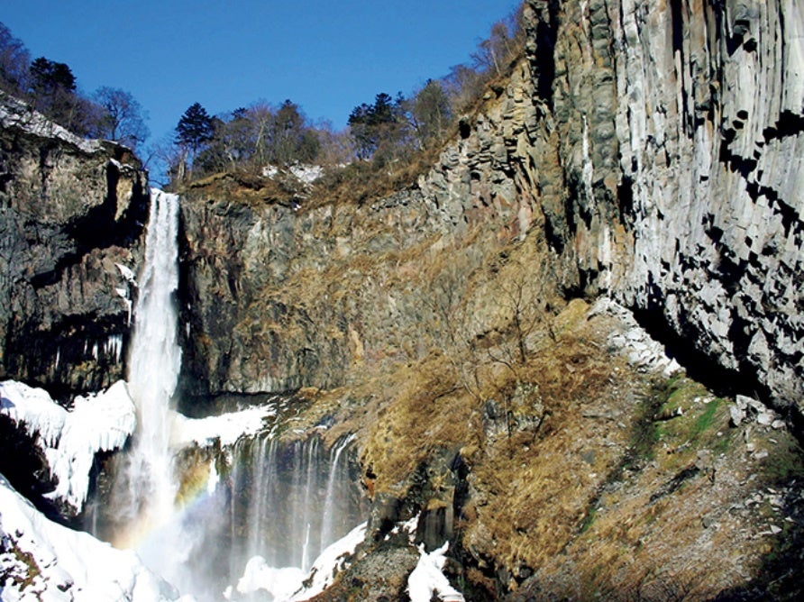 日本三大名瀑のひとつ、落差97mの華厳滝は奥日光の冬を象徴する絶景スポットです。厳寒期には周囲の「十二滝」が凍りつき、氷柱が岩壁を覆う氷瀑となり、青白く輝くブルーアイスが現れることも。澄んだ空気と雪景色に包まれた滝は、まるで氷のシャンデリアのよう。見頃は例年1月下旬~2月上旬で、観瀑台から迫力満点の景観を間近に楽しめます。