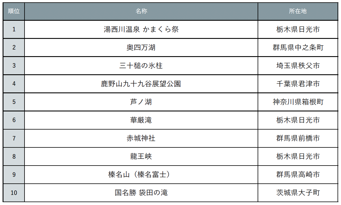 冬は澄んだ空気と静寂が生み出す絶景の宝庫!各地で見応えある冬絶景がたくさん見られます。今回は、関東エリアで楽しめる冬ならではの絶景スポットについてアンケート調査を実施しました。“幻想的”だと思う絶景スポット第1位に選ばれたのは、栃木県日光市「湯西川温泉 かまくら祭」でした。日本夜景遺産にも認定された幻想的な夜景と雪国ならではの体験が楽しめるイベントです。第2位には、群馬県中之条町「奥四万湖」がランクイン。静寂に包まれる奥四万湖で雪景色と際立つ四万ブルーが満喫できます。続く3位は埼玉県秩父市「三十槌の氷柱」で、天然の氷柱の毎年姿が変わる自然の造形美が魅力のスポットです。そのほか、旅行情報サイト『じゃらんニュース』では、TOP10以外にも関東エリアのおすすめ冬絶景スポットを多数紹介しています。(【関東】冬絶景16選:https://www.jalan.net/news/div/212851/)