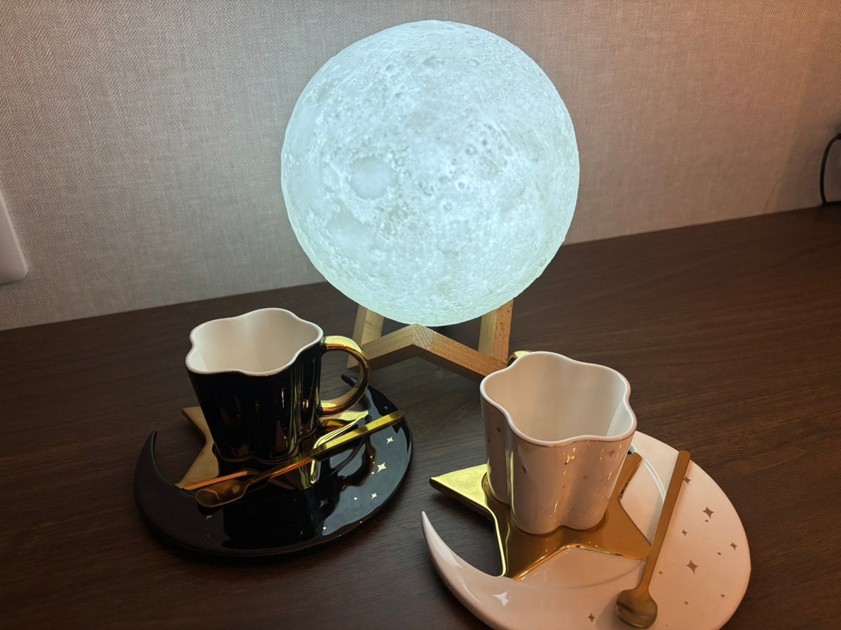 普段は落ち着いた色調のお部屋ですが、星デコレーションルームは、星の小物をたくさんご用意しました。まるで、星々の中にいるようなかわいらしく、華やかなご滞在をお約束します。コーヒーカップやベッド、卓上ライトなど様々な“星“探しをお楽しみいただけます。