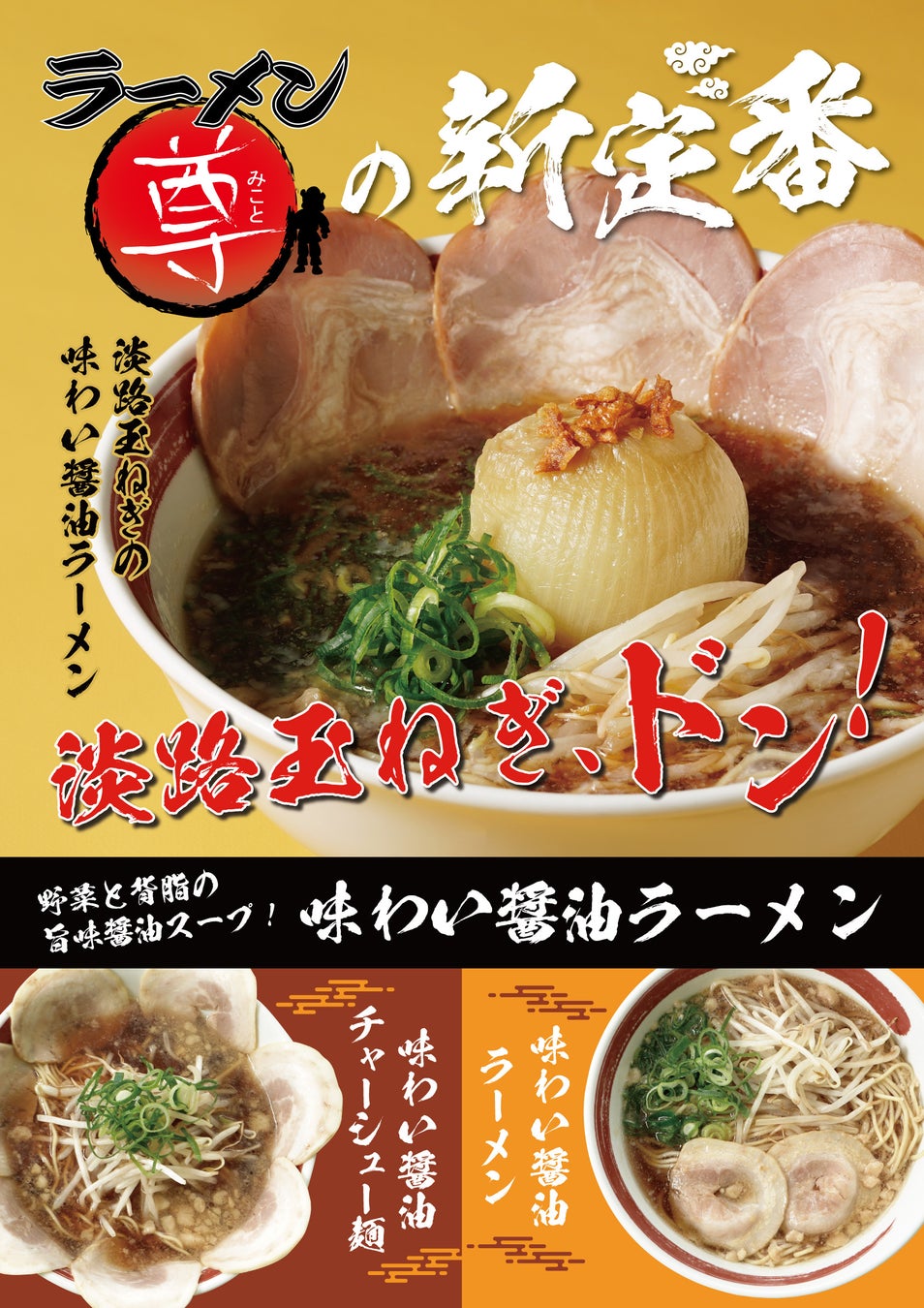 おすすめメニュー 「淡路玉ねぎの味わい醤油ラーメン」などの、全メニューの食材をリニューアル