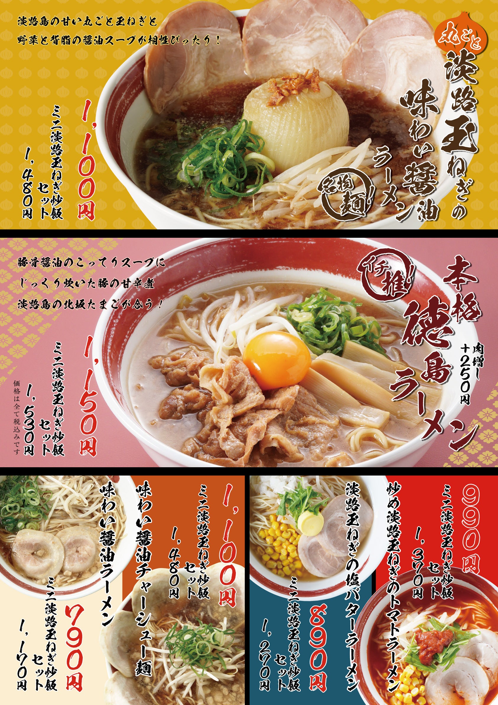 【本格 徳島ラーメン】単品1,150円、ミニ淡路玉ねぎ炒飯セット 1,530円