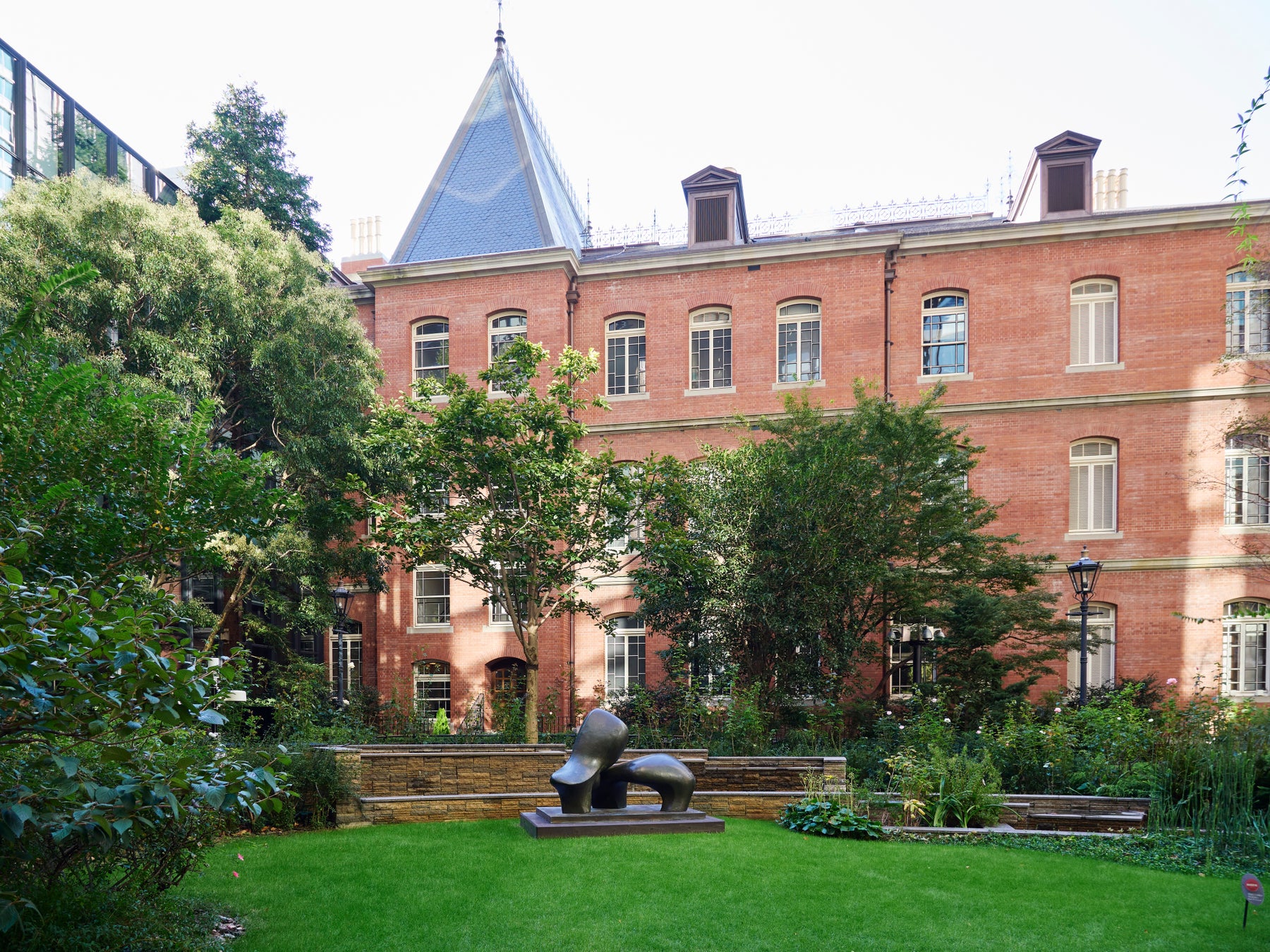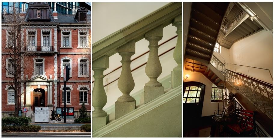三菱一号館は、1894年三菱が丸の内のオフィス街開発の第一号として建設した、赤レンガの洋風事務所建築で、設計は東京駅丸の内駅舎を設計した辰野金吾の恩師、ジョサイア・コンドルです。現在の建物はコンドルの原設計に則って可能な限り忠実に復元されたもの。階段部の手すりの石材など保存されていた部材を一部建物内部に再利用したほか、意匠や部材だけでなく製造方法や建築技術までも、詳細な調査によって再現されています。
