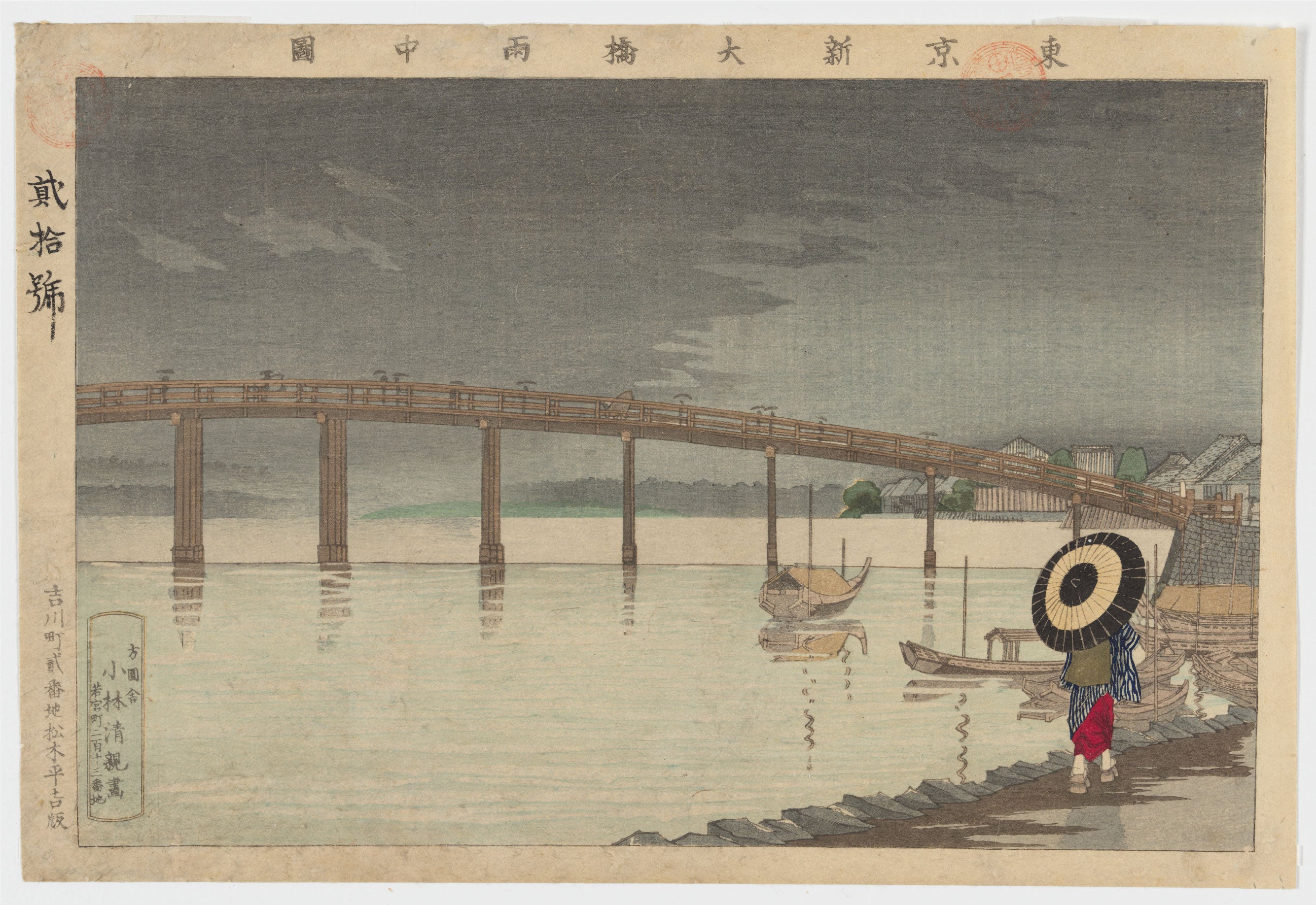 最後の浮世絵師のひとりと呼ばれる小林清親が1876(明治9)年に開始した『東京名所図』は、明治期の風景版画へ大きな変革をもたらしました。黄昏どきの表情や闇にきらめく光の様相を描いた作品群は「光線画」と呼ばれ、深い陰影により江戸の情緒まで捉えています。このような視点は、失われゆく江戸の面影を惜しむ人々の感傷や、それらを記録しようとする写真の意欲とも重なっており、同時代の浮世絵師たちが文明開化により変貌していく都市を、鮮やかな色彩によって楽天的に捉えた開化絵とは一線を画するものでした。明治末期に浮世絵の復興を目指した新版画は、その技術ばかりでなく清親らが画面に留めようとした情趣を引き継いで、新しい日本の風景を発見していきました。清親から吉田博・川瀬巴水らに至る風景版画の流れを、スミソニアン国立アジア美術館のミュラー・コレクションによって辿ります。