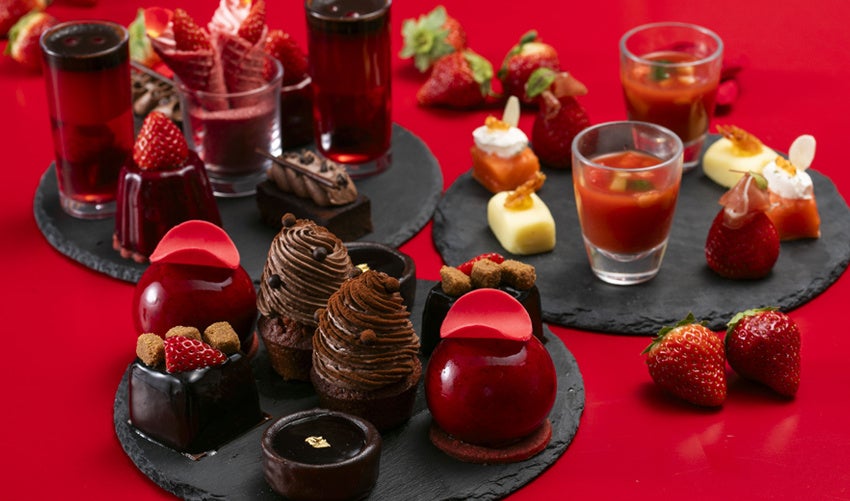 第二弾「朱苺(あけいちご) ‐RUBY MOMENTS‐」は、春の華やぎを感じさせるアフタヌーンティーは、「タルト ショコラ ミロワール」や「ヴェリーヌ ショコラ フランボワーズ」など、深みのあるルビーレッドの艶やかな彩りが目を引き、苺の甘酸っぱさとショコラのコクが重なり合うスイーツのラインアップ。味わうたびに華やかで印象的な世界が優雅に広がります。