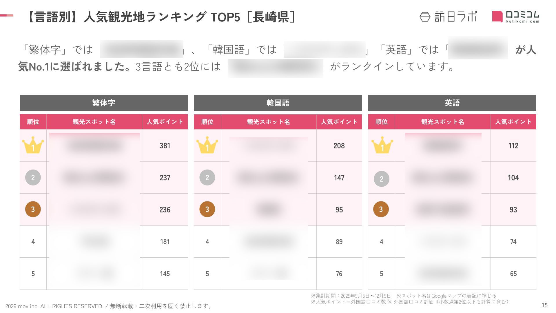 業界最大級のインバウンドビジネスメディア「訪日ラボ」及び 店舗向け集客一元化プラットフォーム「口コミコム」を運営する株式会社mov(代表取締役:渡邊 誠、本社:東京都渋谷区、以下mov)は、長崎県の観光地に寄せられた最新の口コミデータから、独自の『インバウンド人気観光地ランキング』を発表しました。