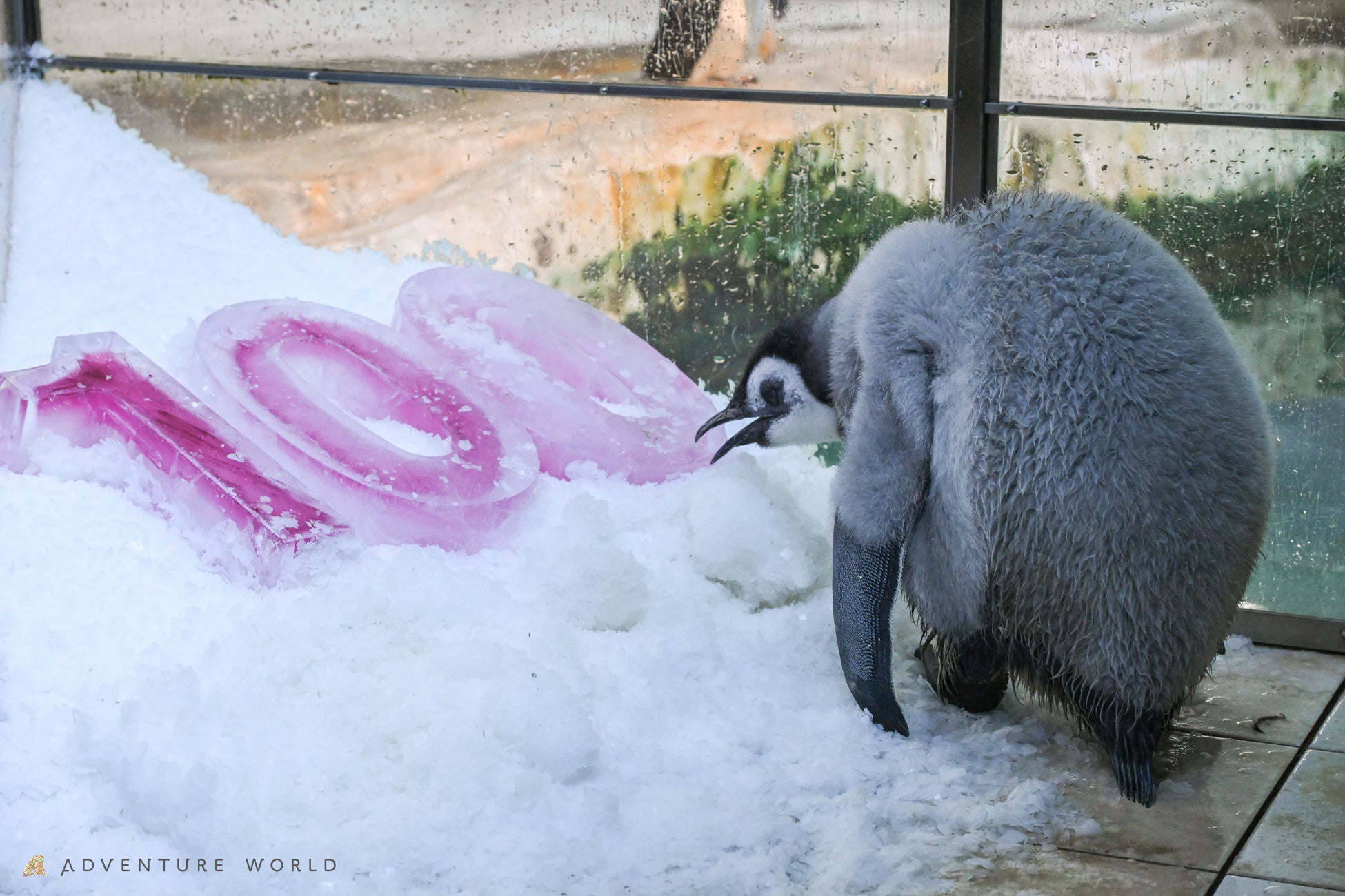 2025年9月30日に誕生したエンペラーペンギンの赤ちゃんが、本日1月8日(木)に100日齢を迎えました!100日齢にちなみ「100」をかたどった氷を赤ちゃんが暮らす育雛スペースに設置し、記念撮影を行いました。