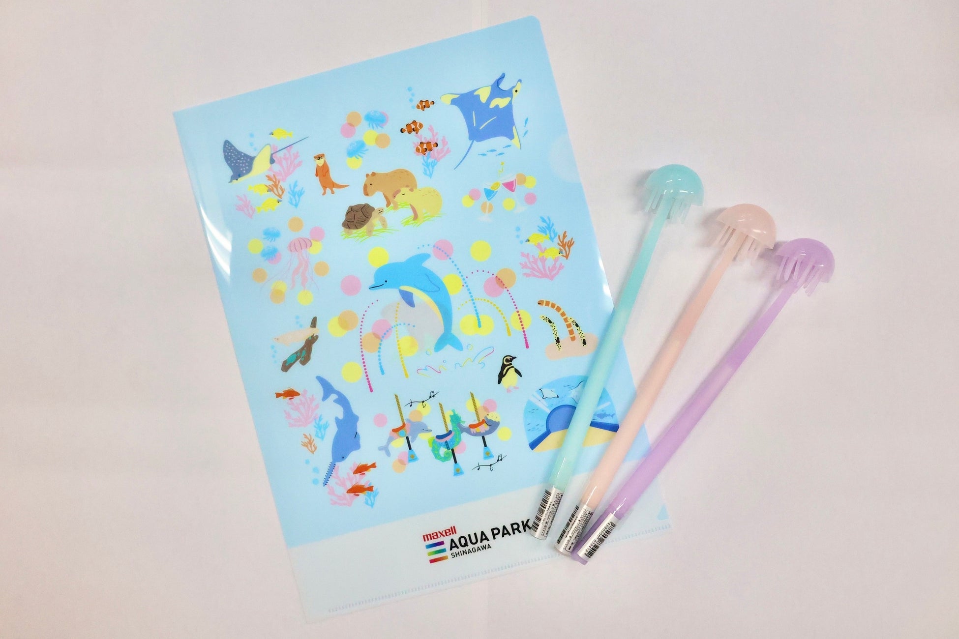 アクアパークの生きものたちや象徴的な水槽、アトラクションが描かれたオリジナルクリアファイル。
