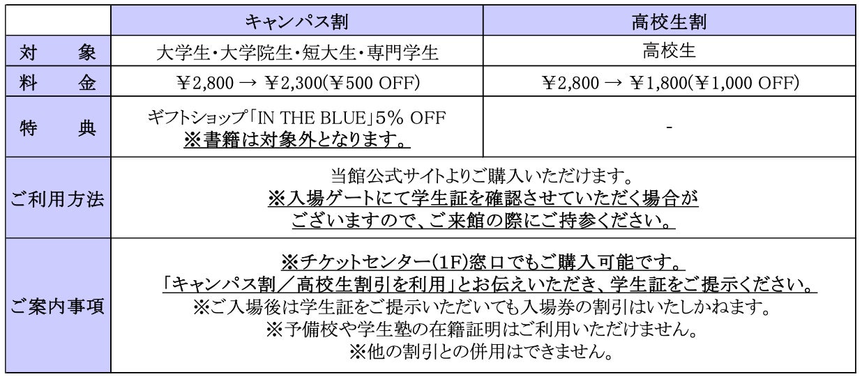 1つ目は、大学生等(大学生・大学院生・短大生・専門学生)を対象にした「キャンパス割」。2026年1月13日(火)~3月19日(木)の期間限定で通常料金2,800円のところ2,300円でご利用いただけます。さらに、ギフトショップ「IN THE BLUE」では、お会計時に「キャンパス割チケット」をご提示いただくと、商品を5%割引でお買い求めいただける特典も!ご友人同士でおそろいで持てるグッズや、グループでシェアできるアイテムなど、ご来館の思い出になる商品をお得にご購入いただけます。