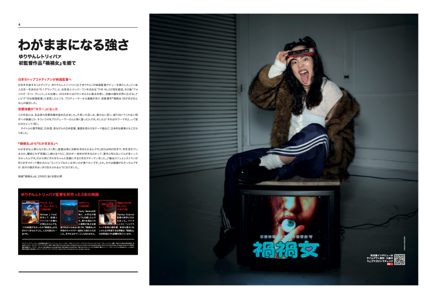 第2号の表紙を飾るのは、初監督作『禍々女(まがまがおんな)』で映画監督デビューを果たしたコメディアン・ゆりやんレトリィバァ。アメリカのオーディション番組「アメリカズ・ゴット・タレント」への出場を経て、活動の軸足を世界へ向けている彼女が、映画制作に込めた思いを語ります。