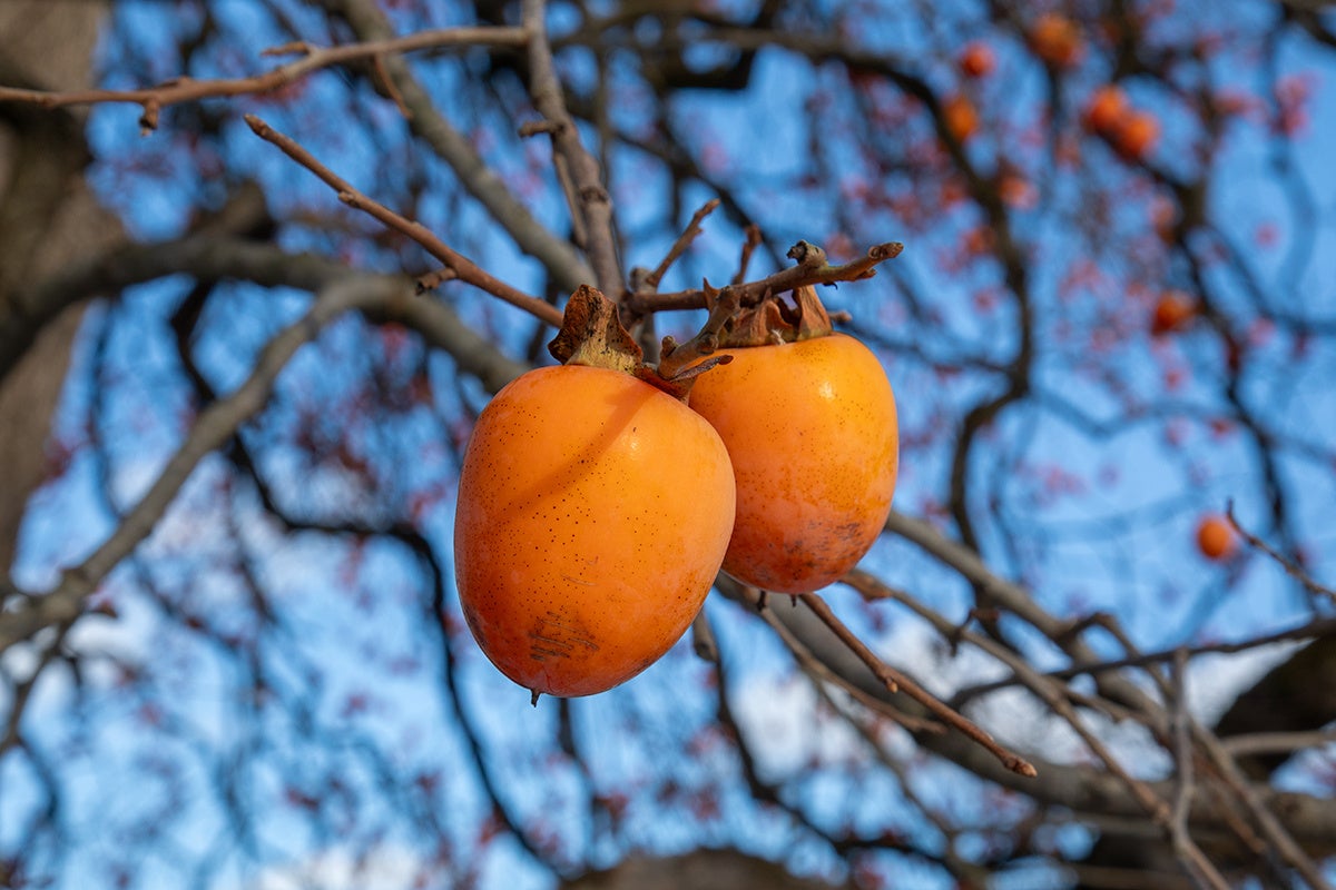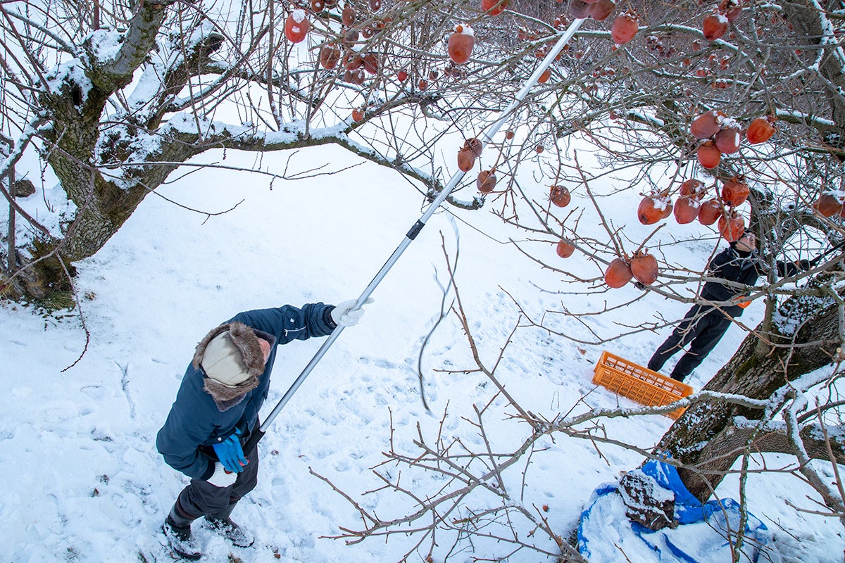 東北牧場では、年を越して木で十分に熟した妙丹柿を「木熟柿」として収穫しています。