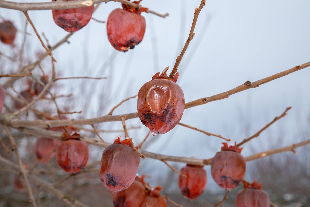 青森の冬夜の厳しい寒さで凍り、朝の陽ざしでゆっくりと溶ける――この状態を何度も繰り返すことで、渋みが自然と抜ける木熟柿。