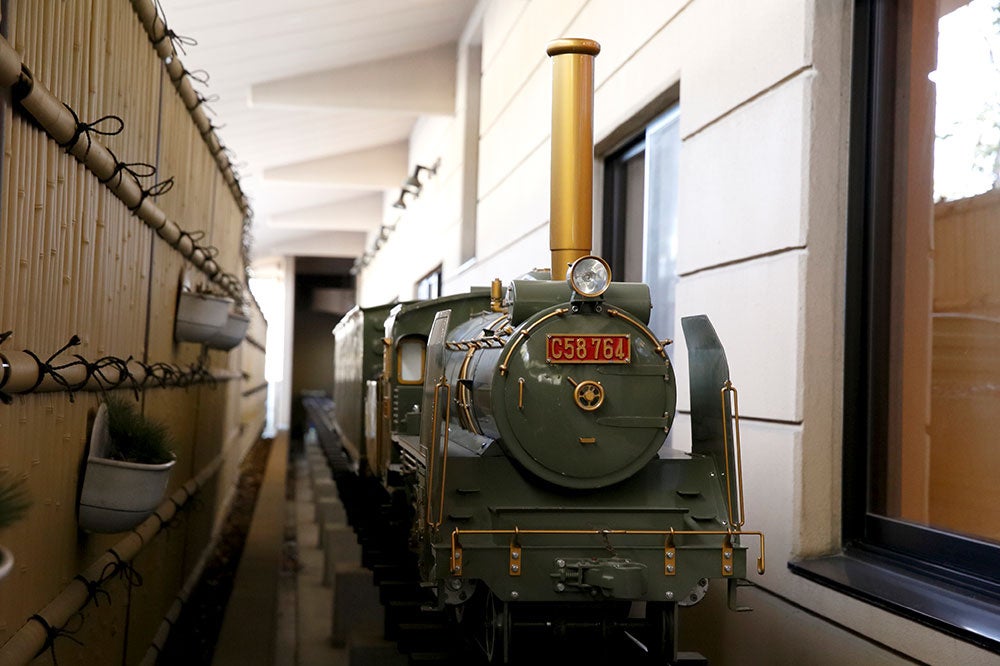 ミニSL列車が料理を運ぶ演出がファミリーやグループに好評な、個室のお食事処「お狩場」。