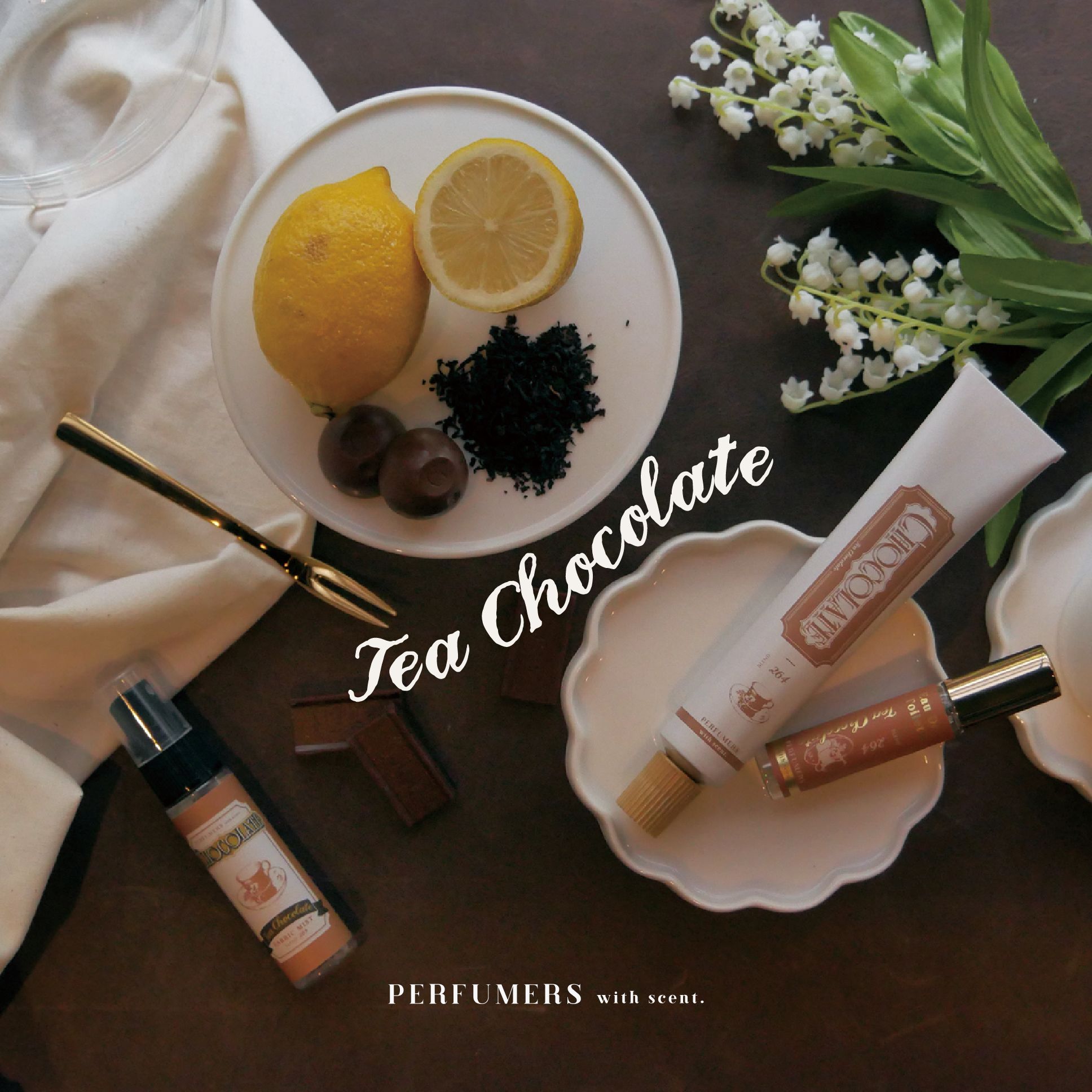 本企画で展開される香りは、日本の調香師が手掛ける香水ブランド「PERFUMERS」のチョコレートコレクションより、「ティーチョコレート」「オランジェット」「ビター」の3種類。
