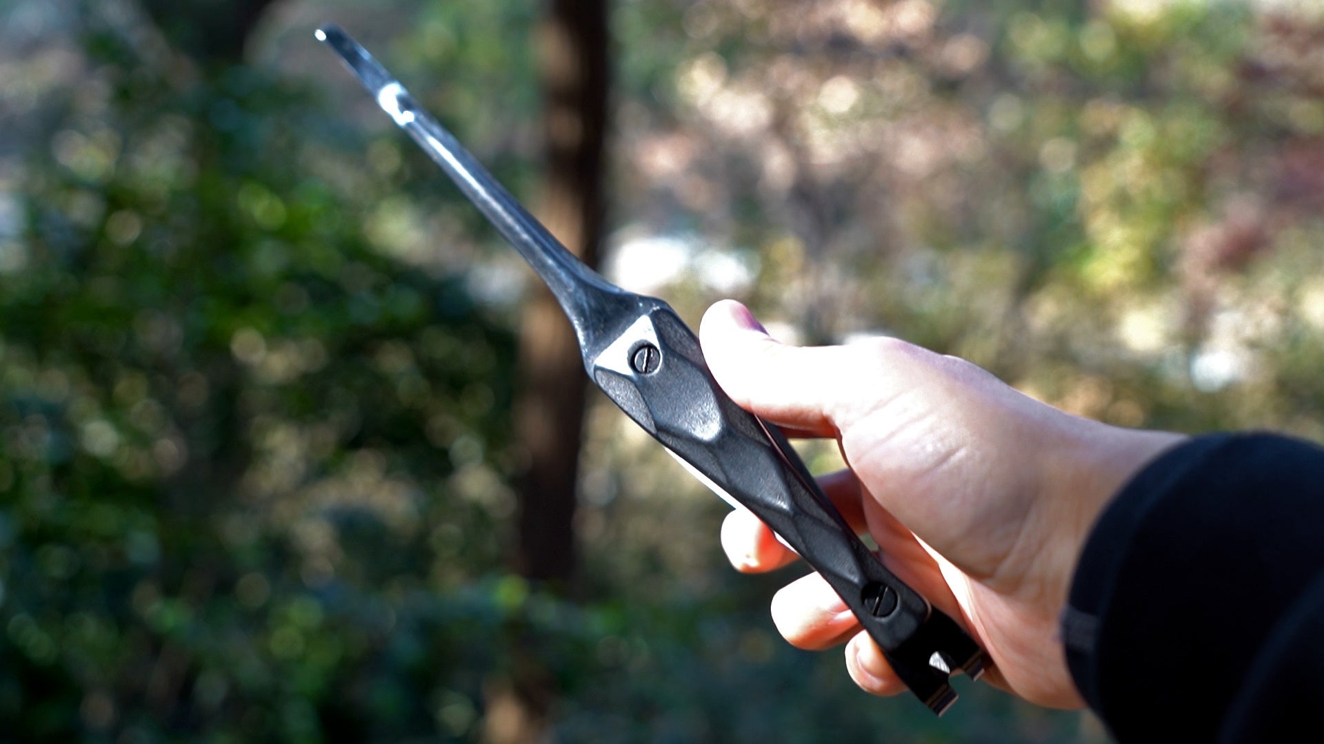 耐熱・耐食性に優れたステンレスは、アウトドアの激しい環境でも扱いやすく、使い込むほど黒の表情が深まる一本です。