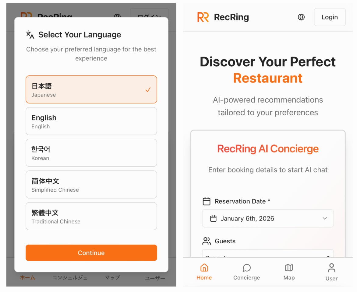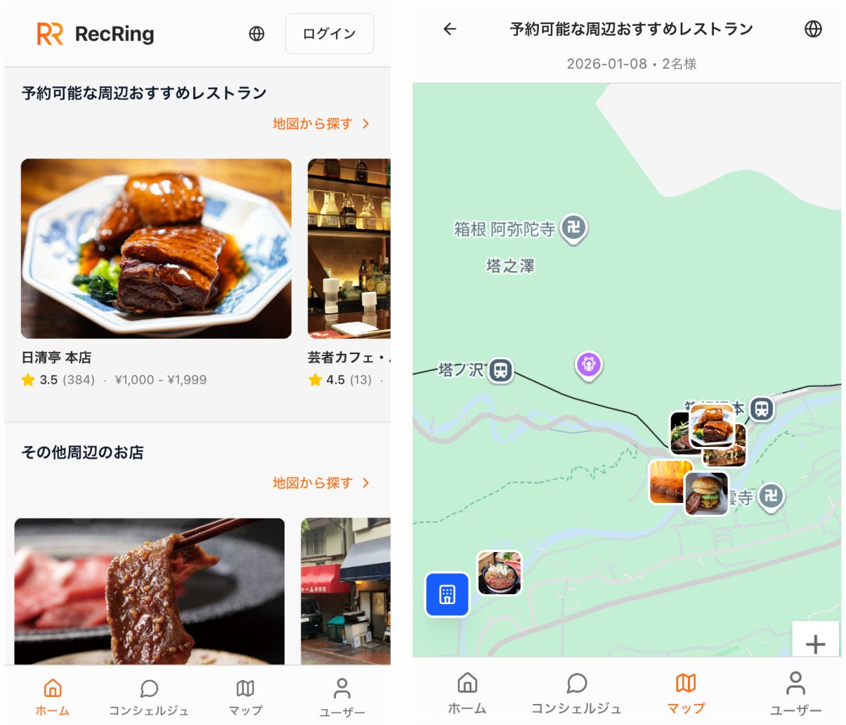 この度、インバウンド旅行者向けの飲食店AI予約サービス「RecRing」をリリースしました。旅行者は宿泊先のホテルの近くの飲食店や、自分の好みに合った飲食店を探すことができます。また、一部店舗では予約を行うことが可能となっております。