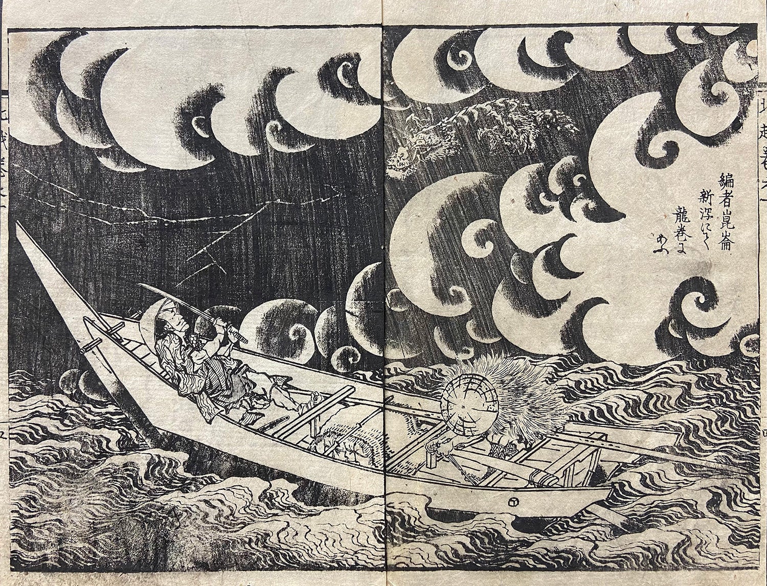 江戸時代の人々が体験した話や、伝承、逸話などをもとにした作品もご紹介します。本図は、新潟の橘崑崙による随筆集をもとにした作品『北越奇談』で、北斎が挿絵を手がけたものです。海上で竜巻に遭遇した崑崙が、雲間から除く竜巻の主と対峙する場面。臨場感あふれる構図と雲や波の迫力のある描写に注目です。