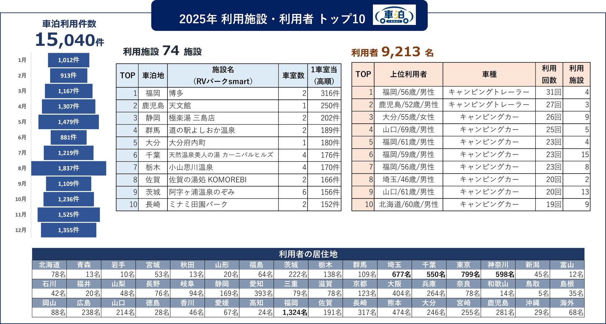 2025年の利用者9,213名の居住地は、福岡が1,324名で最多で、首都圏(東京799・神奈川598・埼玉677・千葉550)は合計2,624名(約28%)と厚く、前年と同様の結果となりました。2025年の上位利用者は、最多31回利用で、利用施設数が最大15施設の例も見られます。前年は年間79回・47回といったヘビーユーザー利用がありましたが、今年は「頻度」だけでなく“複数拠点を使い分ける周遊型”がより鮮明になりました。