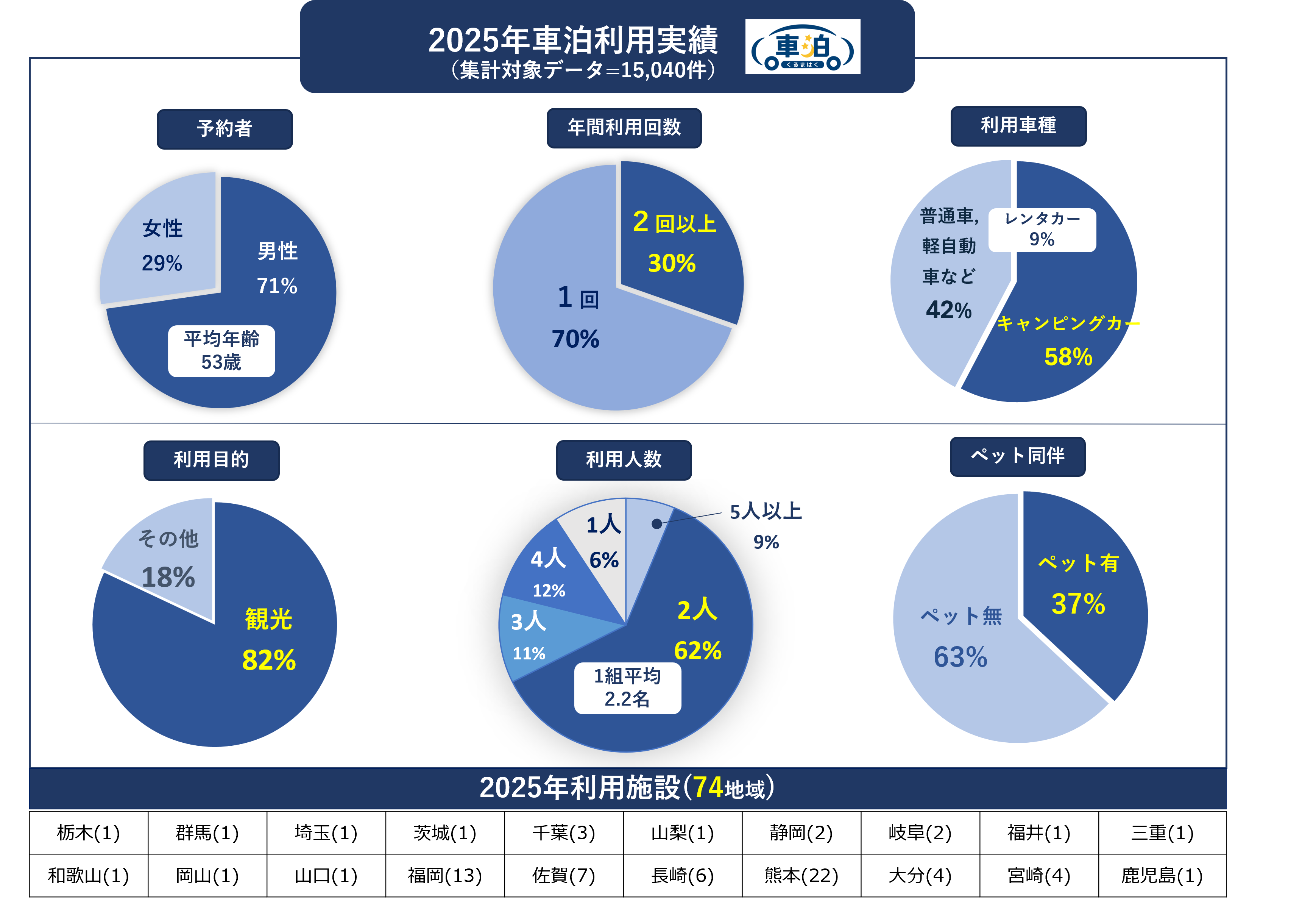 年間の利用回数を見ると、1回利用が70%、2回以上が30%でした。2回以上の割合は前年(31%)からわずかに下がっており、リピーターは一定数いる一方で、新規・ライト層の利用が増えていることがうかがえます。また、利用目的の82%が観光との回答からも、移動性の高い『車泊』は地域の滞在・周遊の拠点として利用されていることがわかります。利用車種は、キャンピングカーが58%、普通車・軽などが42%、その内レンタカー利用は9%と、前年の数値(10%)と同水準となりました。つまり車泊は、キャンピングカーに限らず、普通車やレンタカーでも利用できる“身近な滞在手段”として選ばれ続けていることがわかります。予約者の平均年齢は53歳(前年52歳)とほぼ横ばいで、ペット同伴率も37%(前年38%)と大きな変化はなく、ペット連れ需要が安定して定着していることがわかります。