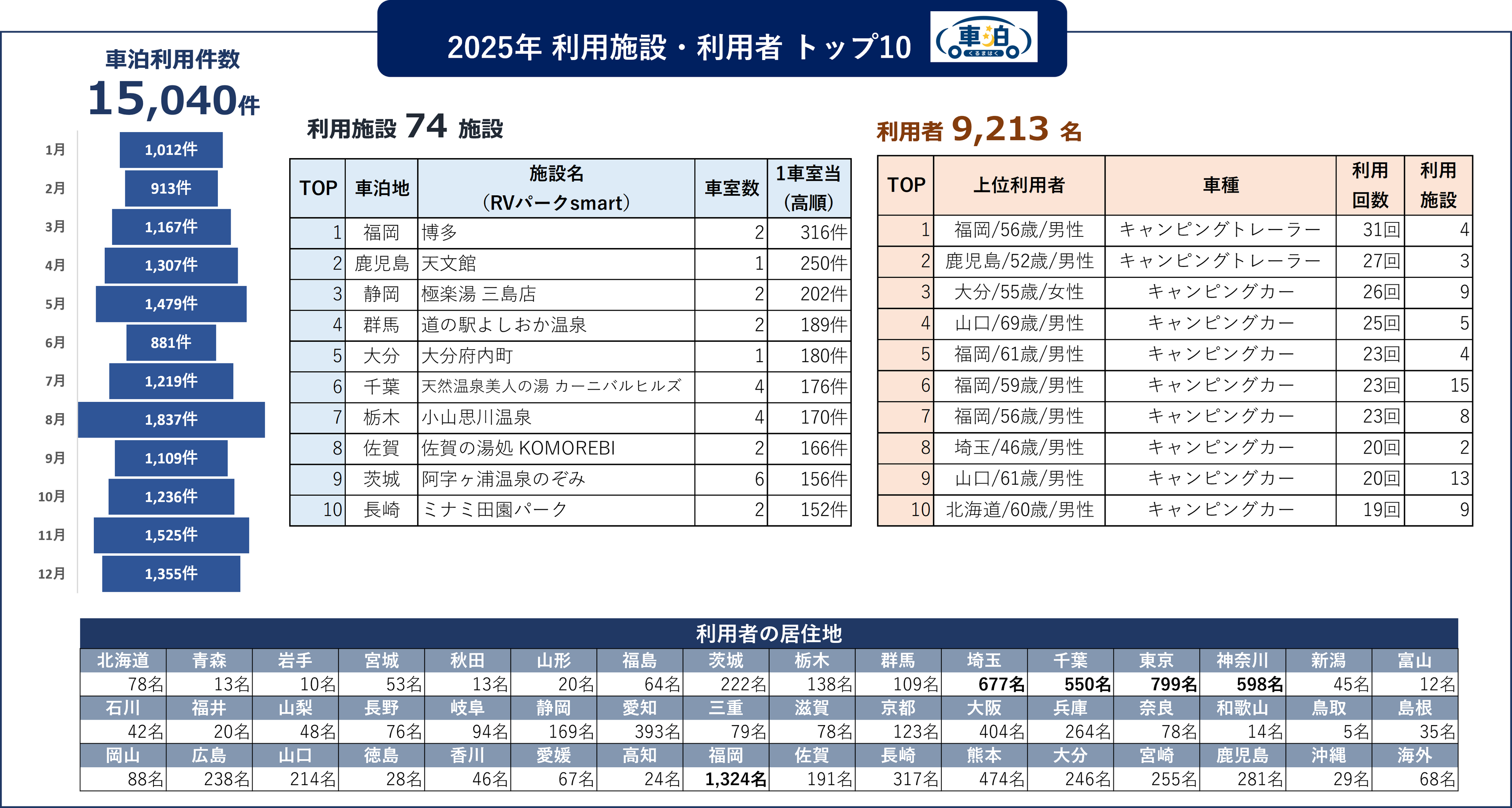 2025年の利用者9,213名の居住地は、福岡が1,324名で最多で、首都圏(東京799・神奈川598・埼玉677・千葉550)は合計2,624名(約28%)と厚く、前年と同様の結果となりました。2025年の上位利用者は、最多31回利用で、利用施設数が最大15施設の例も見られます。前年は年間79回・47回といったヘビーユーザー利用がありましたが、今年は「頻度」だけでなく“複数拠点を使い分ける周遊型”がより鮮明になりました。