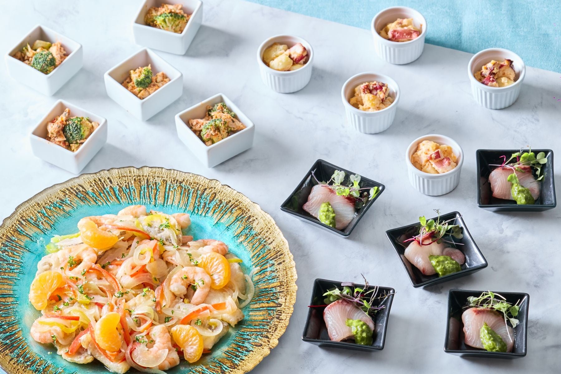 <APPETIZER>愛媛県産ブリのカルパッチョ ルッコラのサルサヴェルデ/瀬戸内みかん香る 白身魚と小海老のエスカベッシュ/真ダコとじゃがいもの冷製ガリシア風ポテトサラダ/徳島県産阿波尾鶏のコンフィ トマトとブロッコリーのトラパニ風