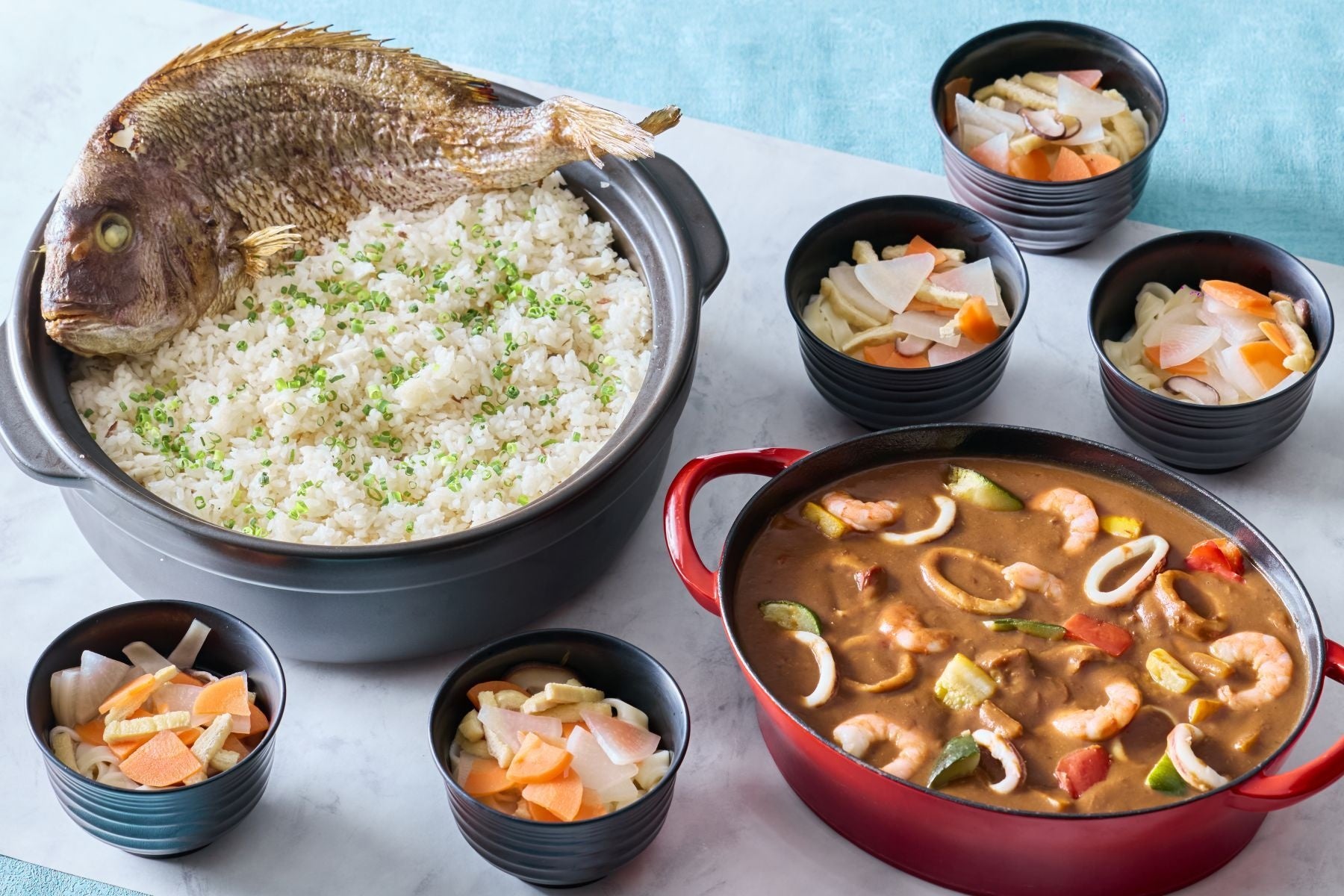 <GOHAN&NOODLE>愛媛県産みかん鯛ともち麦入り鯛めし みかん香るお出汁の鯛めし茶漬け/地中海風シーフードカレー /白米/香川県讃岐 しっぽくうどん