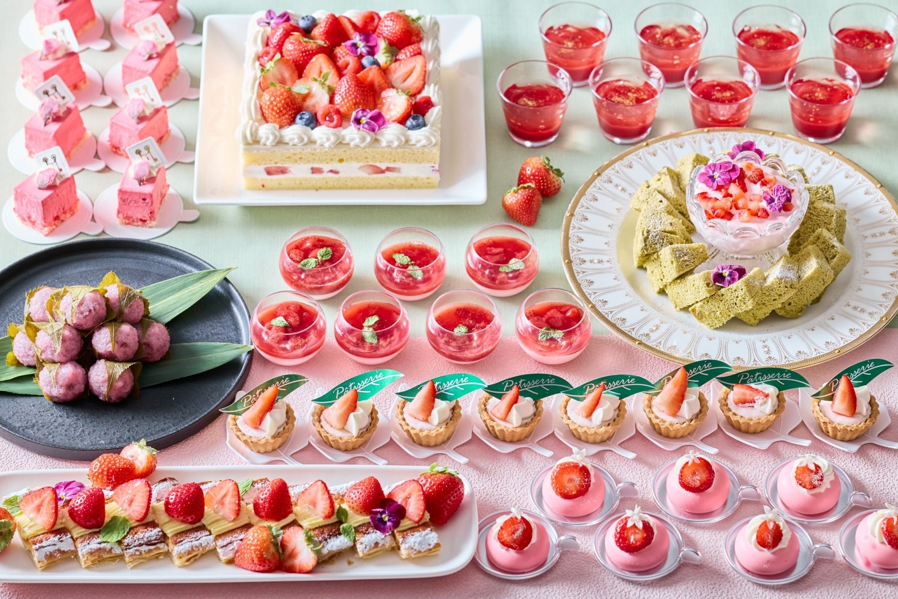 <SWEETS>苺のショートケーキ/苺のバトンパイ/抹茶のシフォンケーキ/桜もち/苺のムース/桜のムース/苺と桜のパンナコッタ/苺とレアチーズのタルトレット/苺のジュレ/みきゃんムース