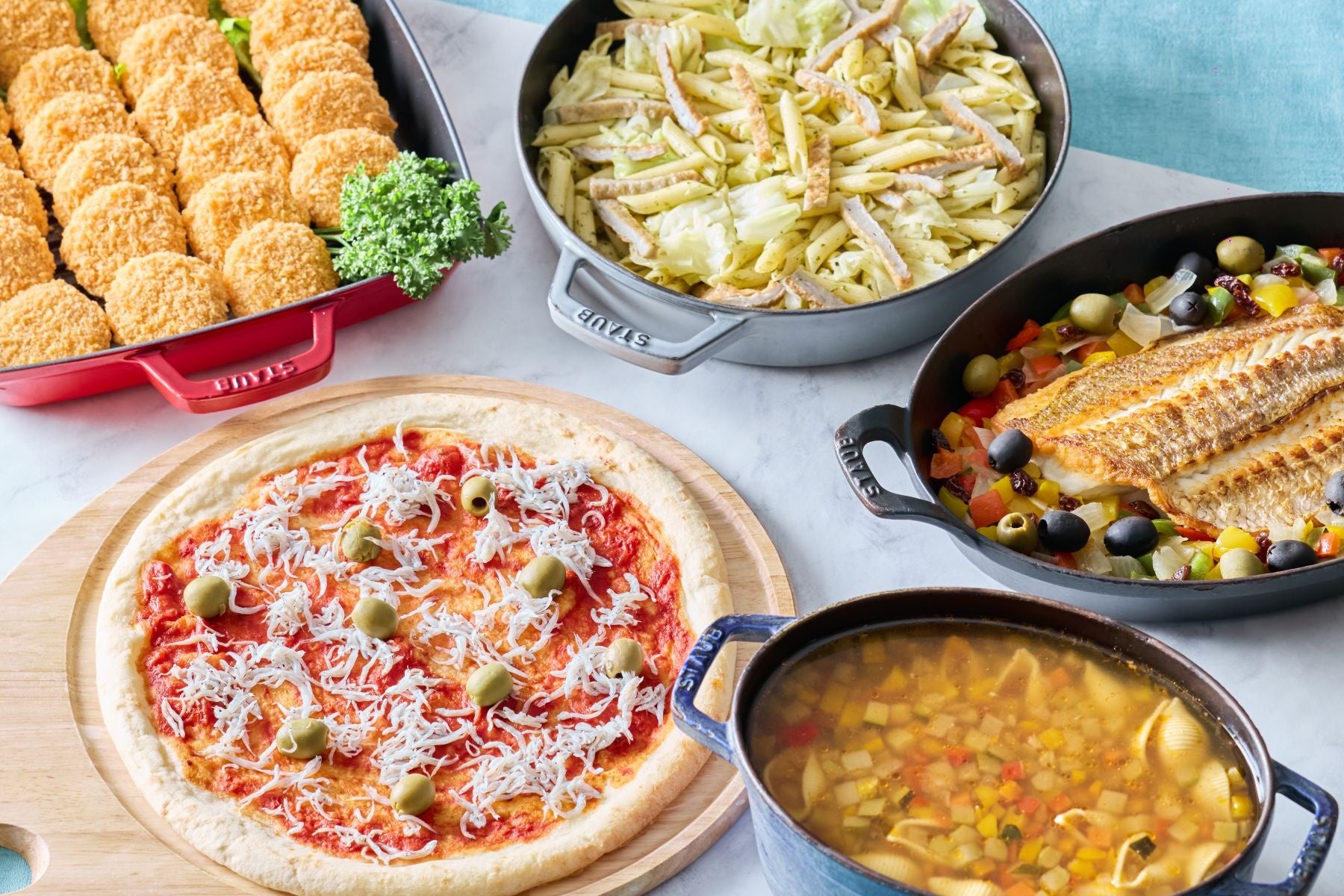 <FISH&SOUP&PASTA>瀬戸内釜揚げしらすとグリーンオリーブのピッツァマリナーラ/宇和島じゃこ天と旬菜のジェノバ風ペンネ/旬魚のロースト 3色パプリカのアグロドルチェ/地中海野菜とショートパスタのミネストローネ/瀬戸内レモン香る 真鯛のカツレツ タルタルソース添え