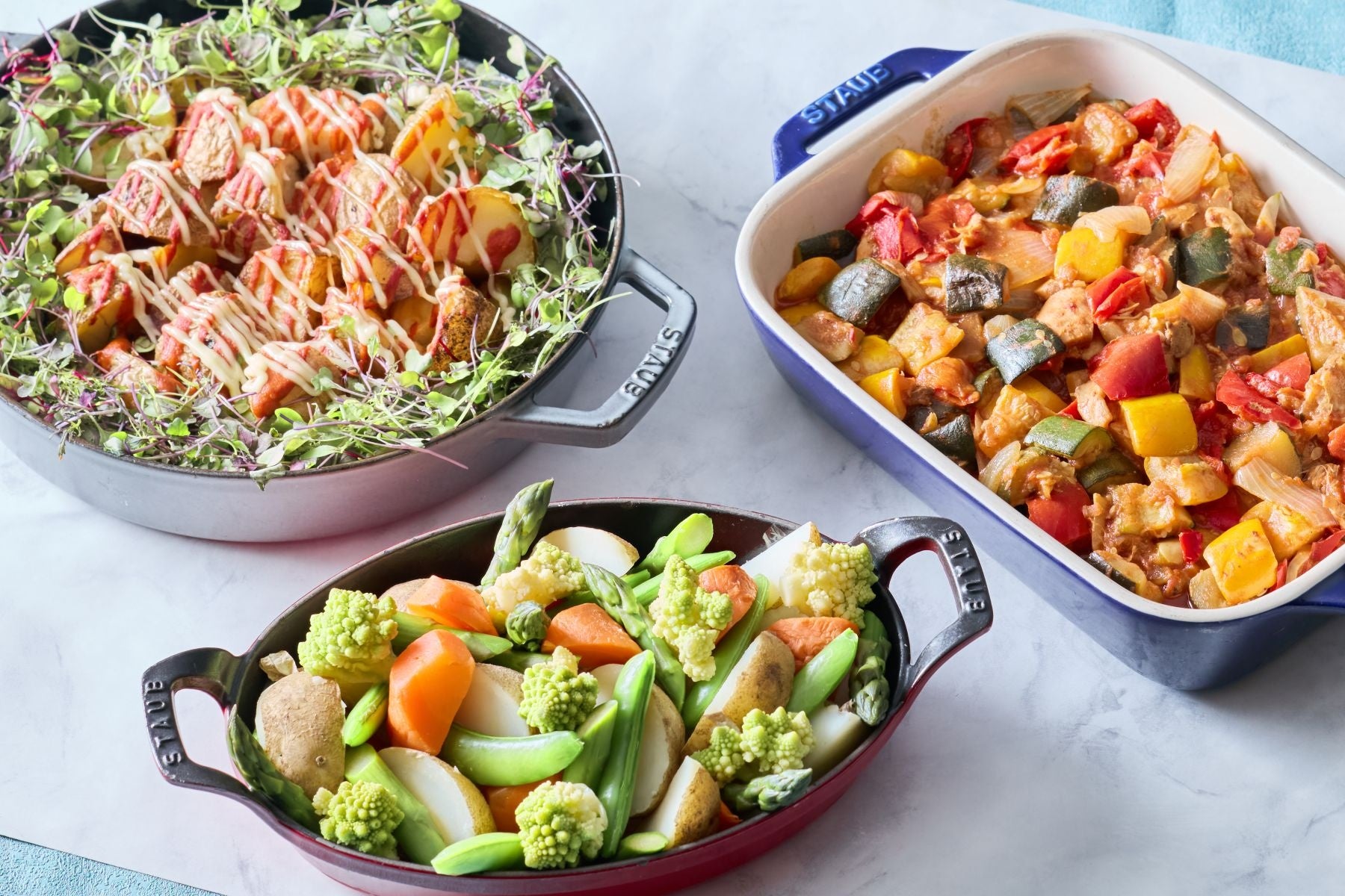 <VEGETABLE>地中海クリスタルフレークソルトで食べる旬の野菜ロースト(爽やかレモンソルト、薫るローズマリーソルト、ピリッとレッドチリソルト、ヘルシー&ビューティー竹炭ソルト)/ごろごろ地中海野菜のラタトゥイユ/マッシュポテト/パタタス ブラバス&アイオリソース添え
