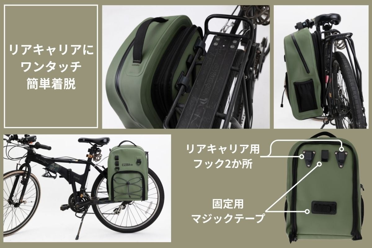 自転車リアラック用フックと固定マジックテープがついており、ワンタッチで自転車リアラックに簡単に着脱ができます。