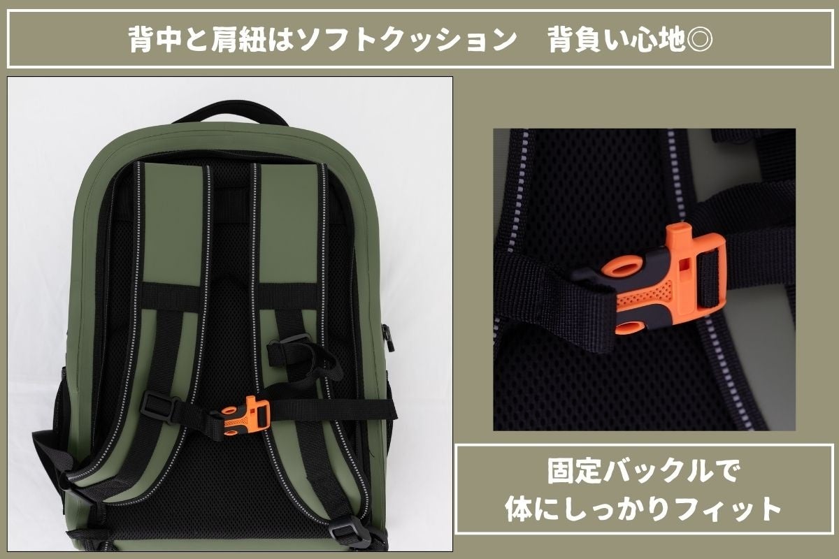 リュック背面と肩紐はソフトクッションとなっているため、背負い心地が良く、長時間の使用でも疲れにくい設計となっています。